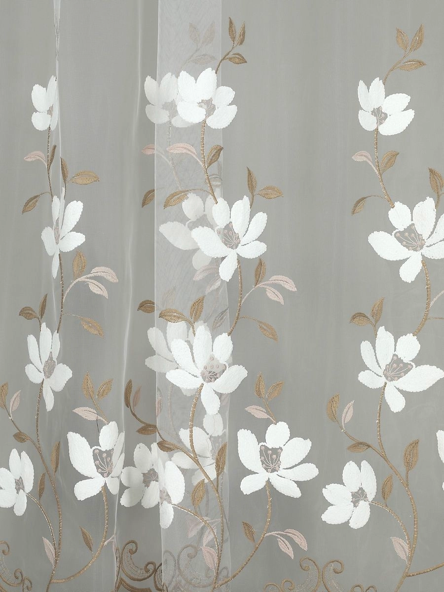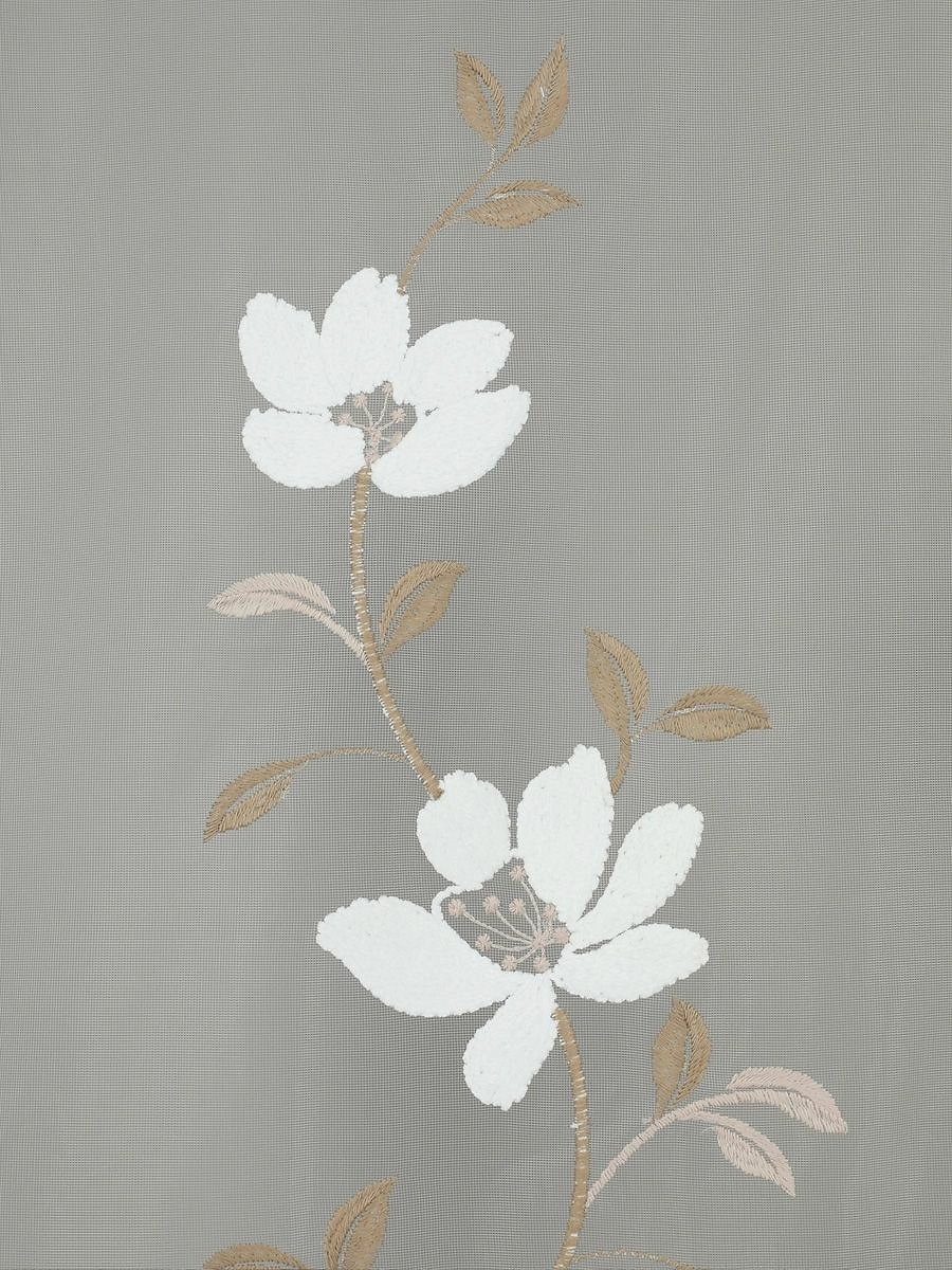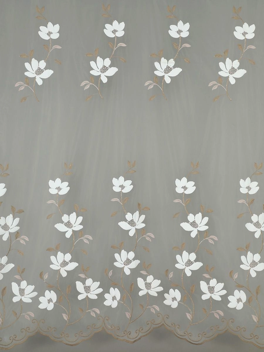 Штора тюлевая из мелкой сетки с вышивкой с виде больших цветов с коричневым рисунком размер 300x270 см будет прекрасно смотреться в комплекте с плотными шторами. Крепление шторная лента.