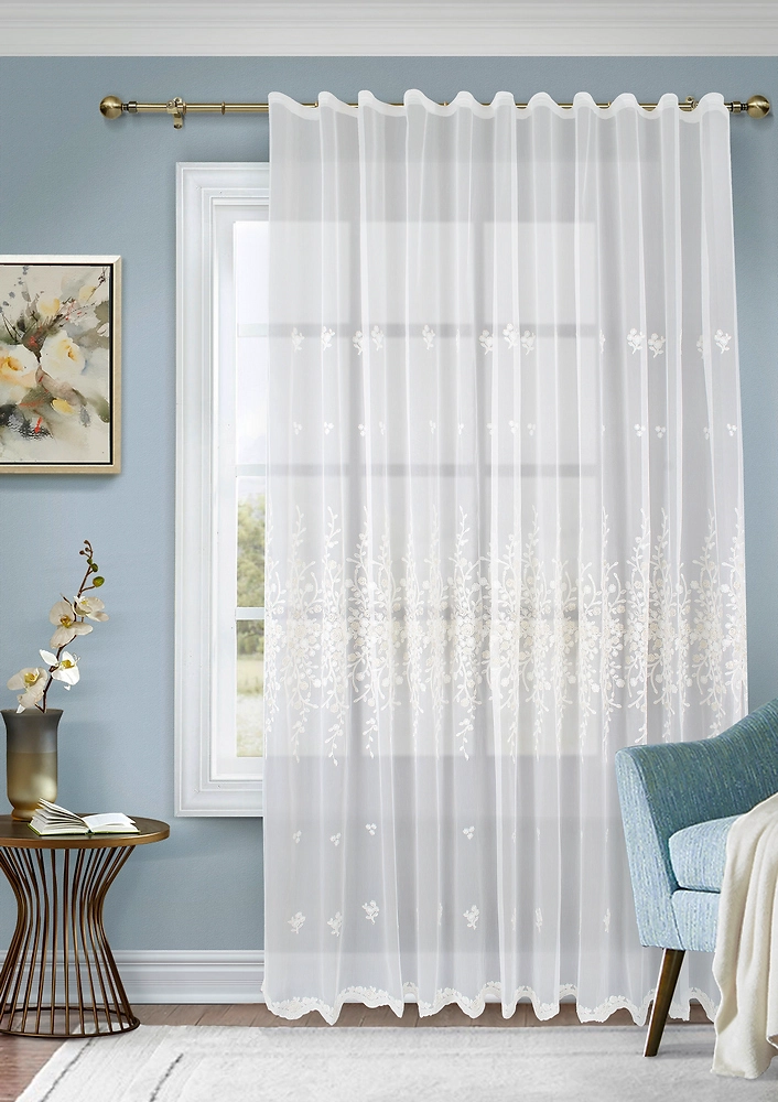 Тюль с вышивкой легко сочетается с различными видами портьер.