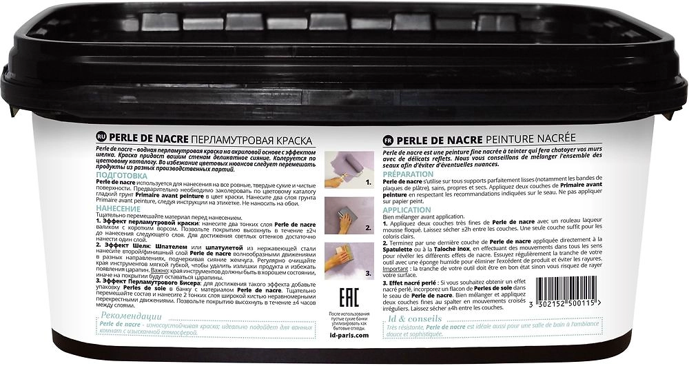Краска интерьерная ID PERLE D'NACRE на акриловой основе придает стенам деликатное сияние. При нанесении валиком с коротким ворсом образует гладкое перламутровое покрытие. С помощью шпателя можно создать эффект шелка. Использование широкой кисти и добавление шариков ID PERLES DE SOIE позволяет получить эффект перламутрового бисера.