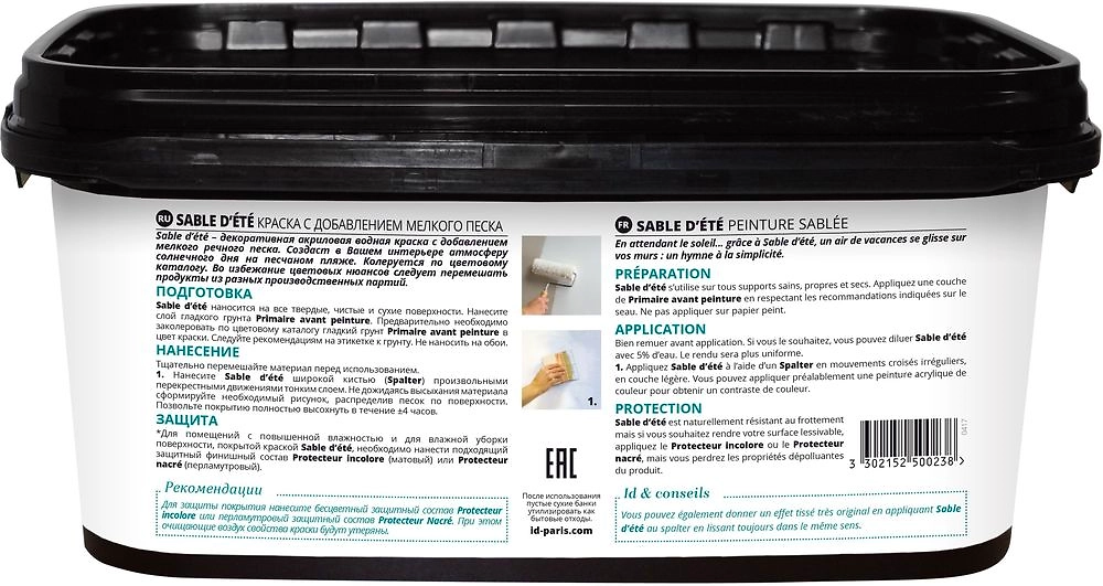 Краска интерьерная ID SABLE DETE с добавлением мелкого речного песка наносится на потолок и стены, образует приятное на ощупь покрытие, улучшает качество воздуха в помещении, создает в интерьере атмосферу солнечного дня на пляже.