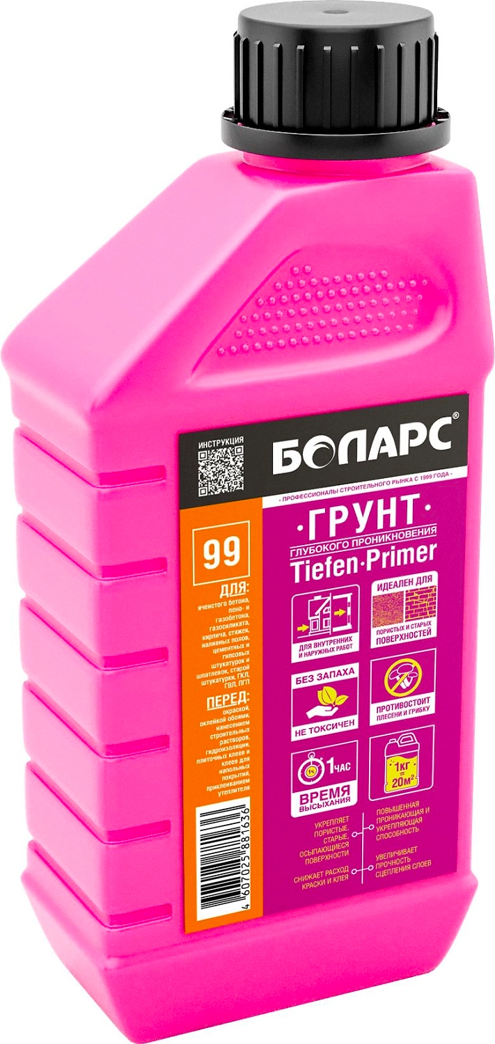 Грунтовка глубокого проникновения БОЛАРС предназначена для укрепления пористых, рыхлых, старых, осыпающихся, сильно впитывающих влагу оснований перед последующим нанесением строительных растворов и отделочных материалов, перед окраской и оклейкой обоями, перед нанесением гидроизоляции, плиточных клеев и клеев для напольных покрытий, приклеиванием плит утеплителя. Глубоко проникает в основание и запечатывает поры. Снижает впитывающую способность основания, связывает пыль, увеличивает сцепление материалов с основанием, обеспечивает долговечность отделки. Экономит расход отделочных материалов, обеспечивая их равномерное нанесение. Рекомендован для помещений с повышенной влажностью (кухни, ванные комнаты).