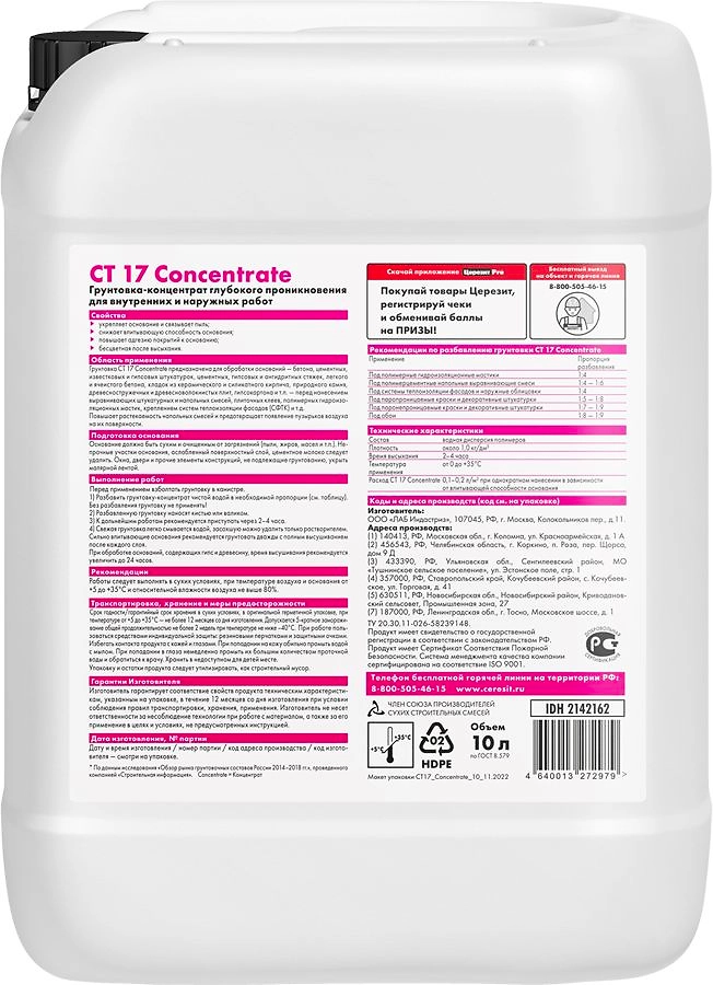 Грунтовка CT 17 Concentrate предназначена для обработки впитывающих, сильно впитывающих и непрочных оснований - бетона, цементных, известковых и гипсовых штукатурок, цементных, гипсовых и ангидритных стяжек, легкого и ячеистого бетона, кладок из керамического и силикатного кирпича, природного камня, древесностружечных и древесноволокнистых плит, гипсокартона и т.п. - перед нанесением выравнивающих штукатурных и напольных смесей, плиточных клеев, полимерных гидроизоляционных мастик, креплением систем теплоизоляции фасадов (СФТК) и т.д.