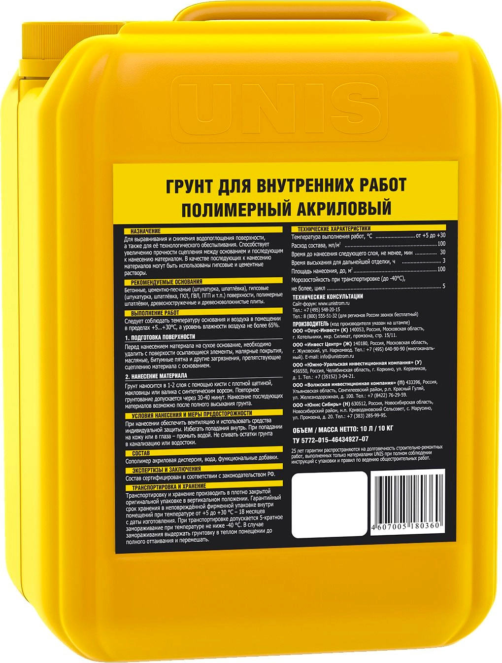 Готовый к применению акриловый полимерный грунт. Для выравнивания и снижения влагопоглощения поверхности, увеличения прочности сцепления между основанием и последующим к нанесению материалом, существенно снижая его расход. В качестве последующих к нанесению материалов могут быть использованы гипсовые и цементные растворы, лакокрасочные материалы. Для подготовки поверхностей помещений с нормальной влажностью.