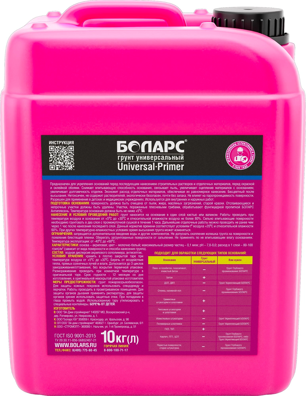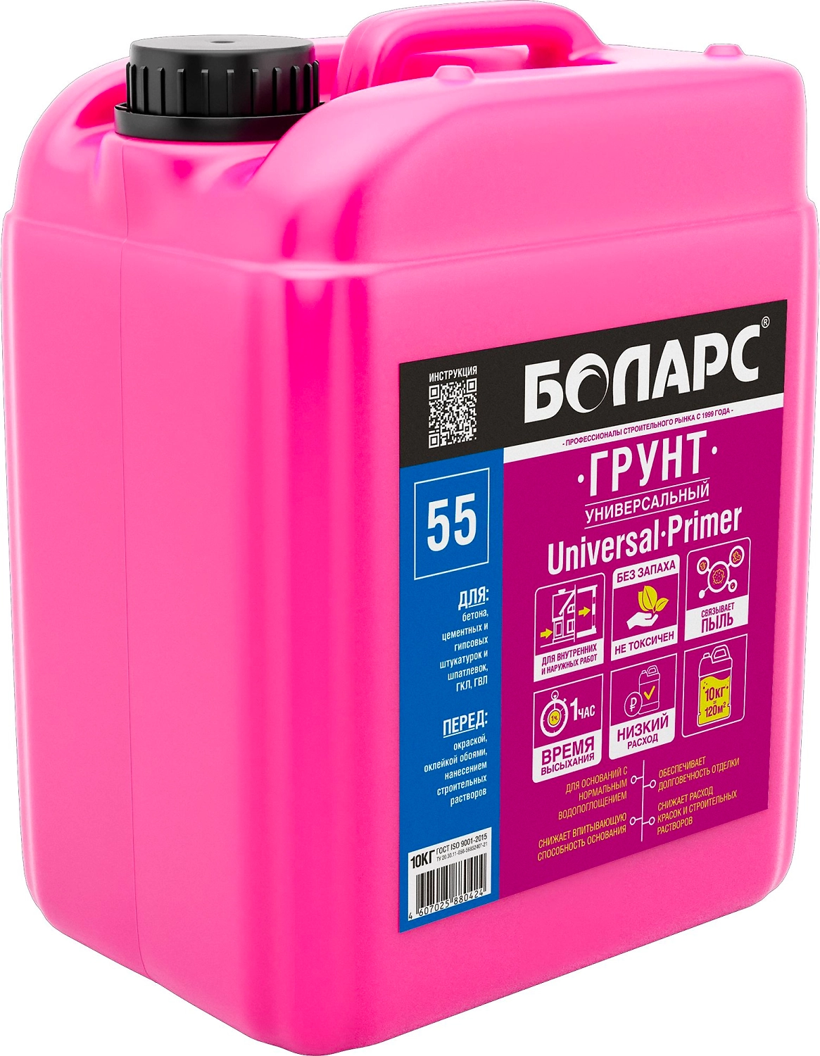 Грунтовка универсальная БОЛАРС предназначена для укрепления оснований с нормальным водопоглощением для последующего нанесения строительных растворов, отделочных материалов и красок.