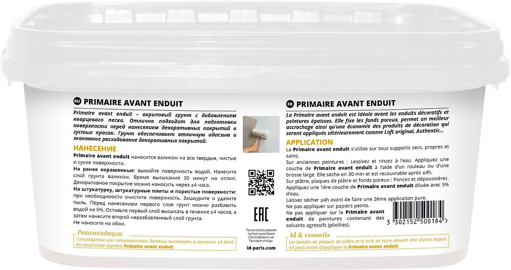 Primaire avant enduit – акриловый грунт с добавлением кварцевого песка для стен и потолков. Одной упаковки достаточно для обработки +-25м2 малярным валиком. Отлично подходит для подготовки поверхности перед нанесением тяжелых декоративных покрытий и густых красок. Грунт обеспечивает отличную адгезию и экономное расходование декоративных покрытий.