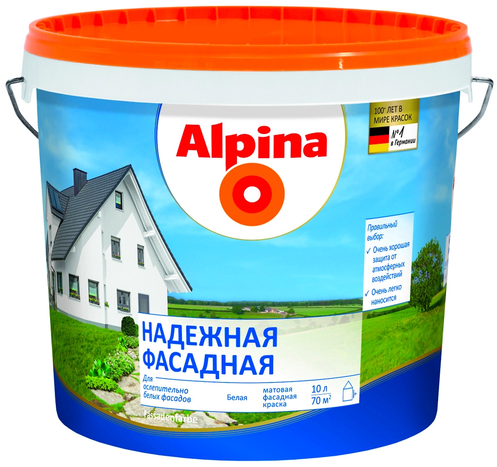 Краска ALPINA Надежная фасадная белая 10 л предназначена для наружных работ. Подходит для оснований из бетона, кирпича, оштукатуренных поверхностей.