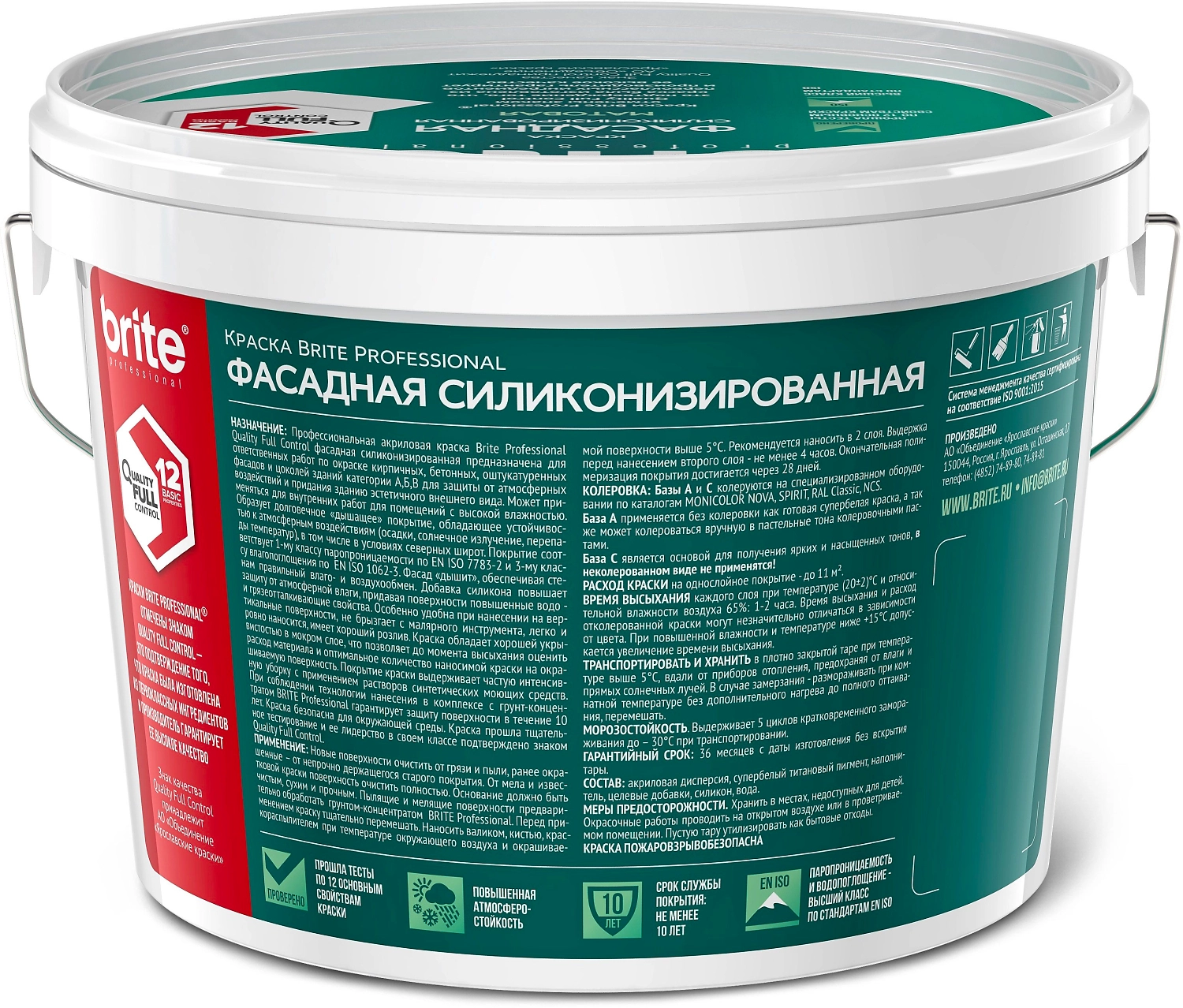 Профессиональная акриловая краска Brite Professional Quality Full Control фасадная матовая с добавлением силикона. Образует долговечное дышащее покрытие, устойчивое к атмосферным воздействиям и перепадам температур, в том числе в условиях северных широт.