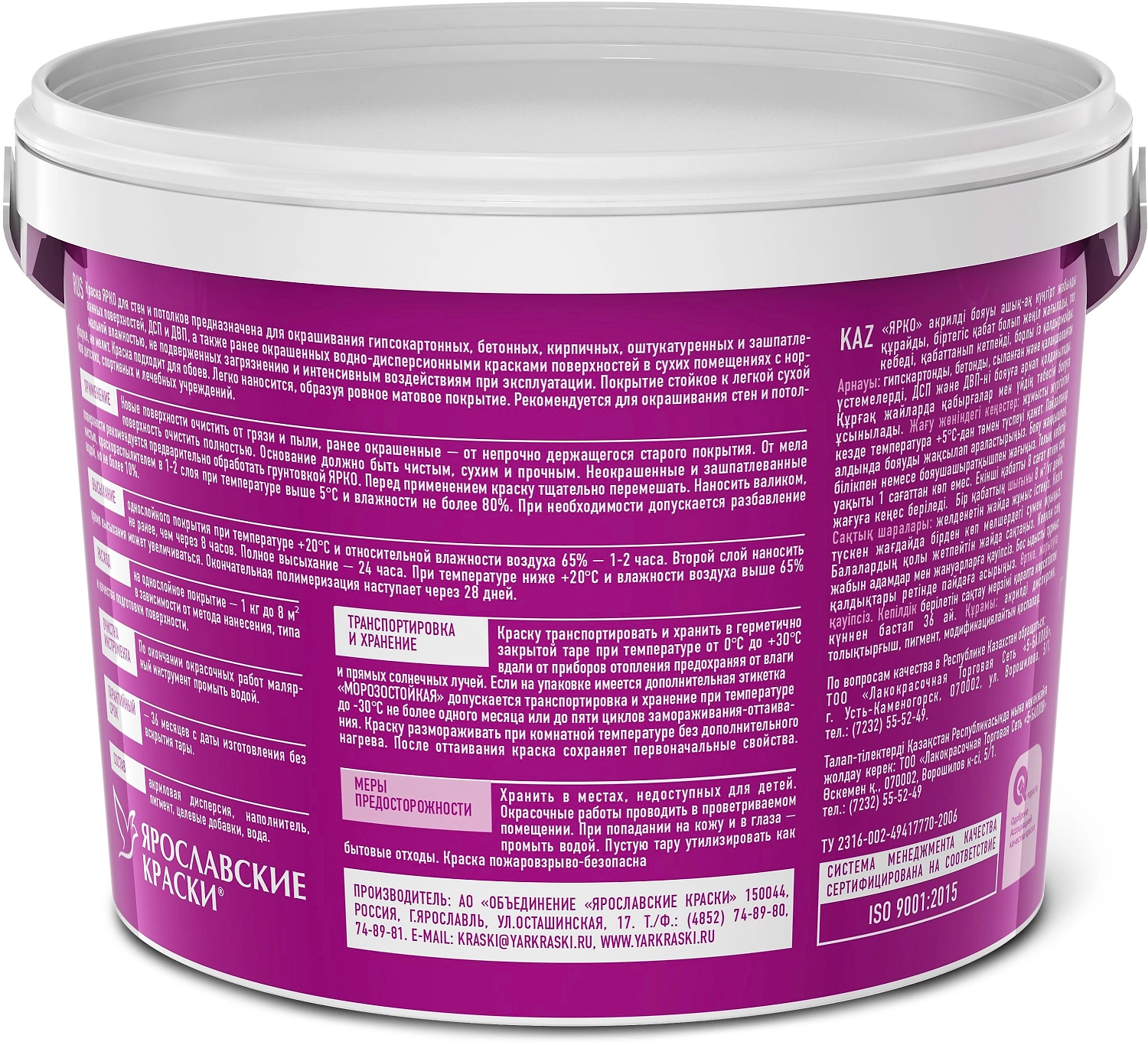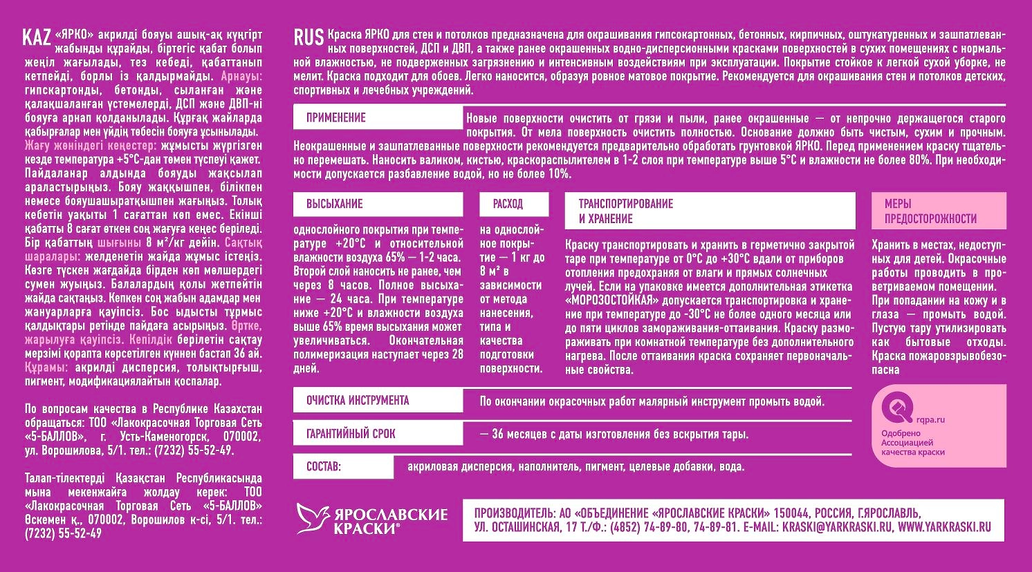 Акриловая краска для стен и потолков ЯРКО предназначена для окраски гипсокартонных, бетонных, оштукатуренных и зашпатлеванных поверхностей, ДСП и ДВП в сухих помещениях с нормальной влажностью.