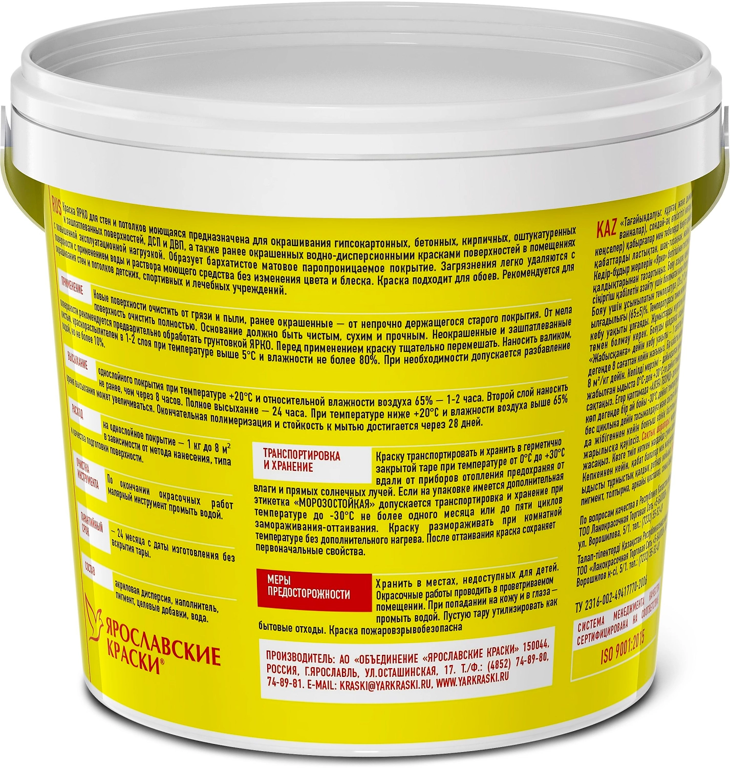 Краска моющаяся для стен и потолков ЯРКО супербелая ведро 1,3 кг