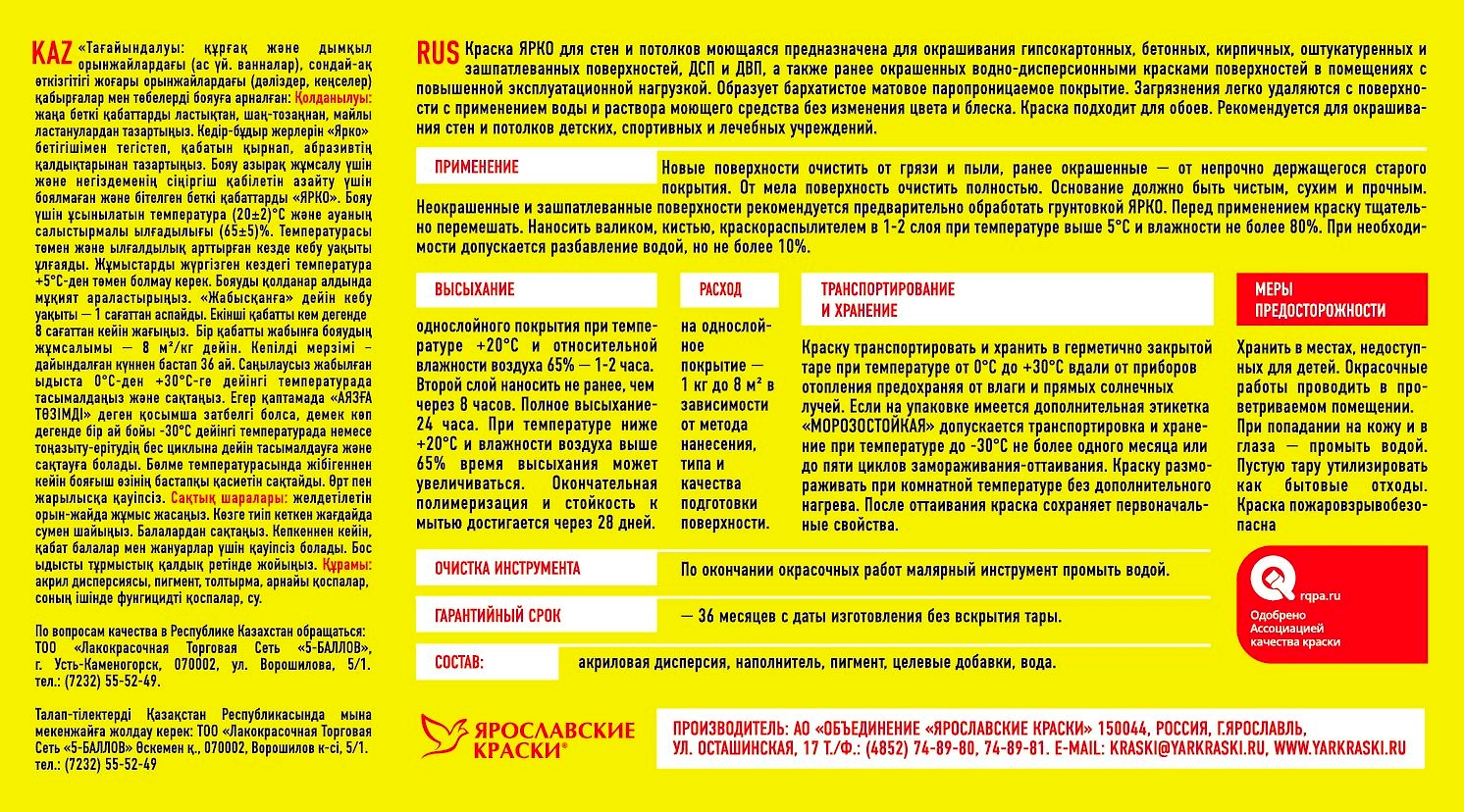 Супербелая акриловая краска ЯРКО предназначена для окраски гипсокартонных, бетонных, оштукатуренных и зашпатлеванных поверхностей, ДСП и ДВП в помещениях с повышенной эксплуатационной нагрузкой (в том числе коридоры, холлы, офисы). Подходит для обоев под покраску.