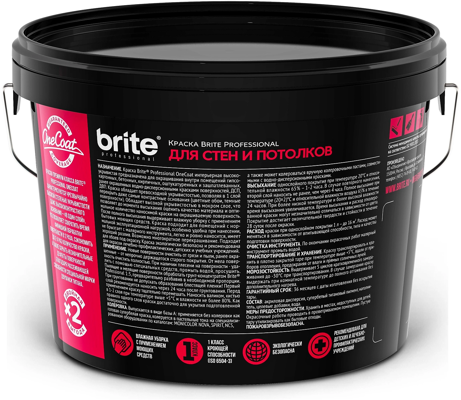 Высокоукрывистая интерьерная краска Brite One Coat для стен и потолков позволяет перекрыть в один слой самые контрастные основания и сократить время финишной обработки поверхности в 2 раза. Благодаря рассевающей способности двуокиси титана скрывает незначительные дефекты поверхности.