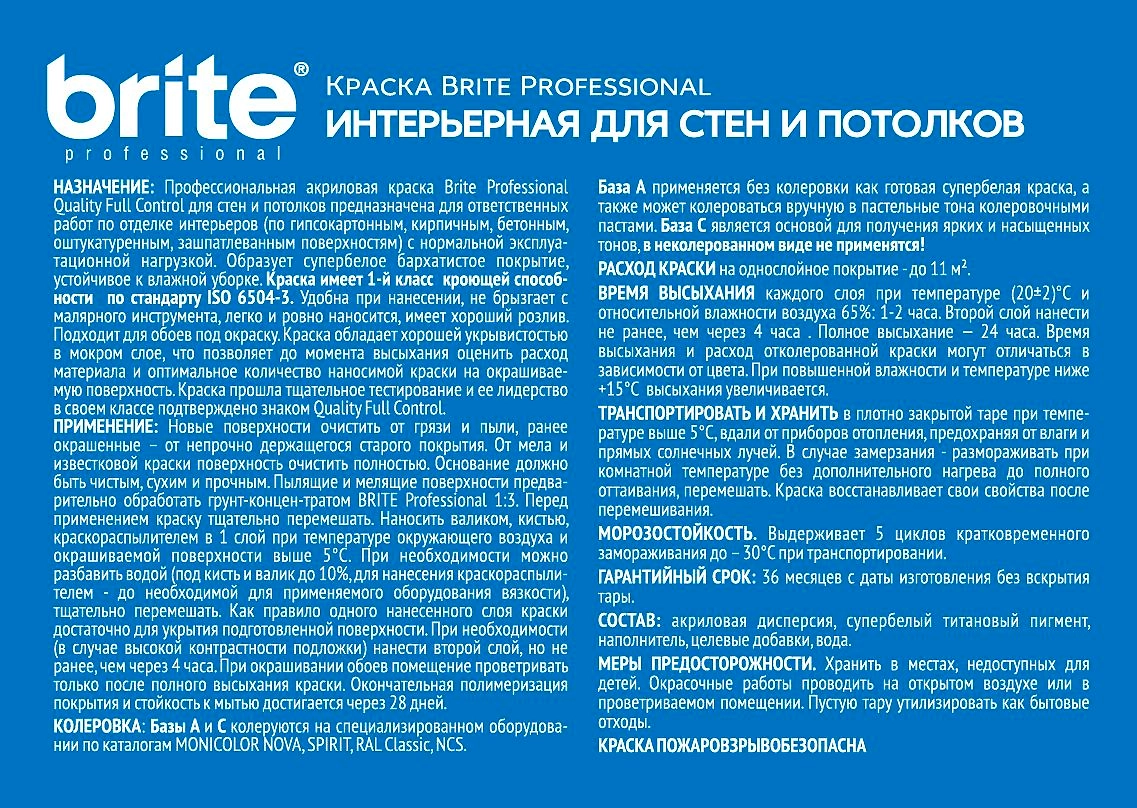 Профессиональная акриловая краска Brite Professional Quality Full Control для стен и потолков. После высыхания образует супербелое матовое покрытие, устойчивое к сухой уборке. Удобна при нанесении, не брызгает с малярного инструмента, легко и ровно наносится. Подходит для обоев под покраску.