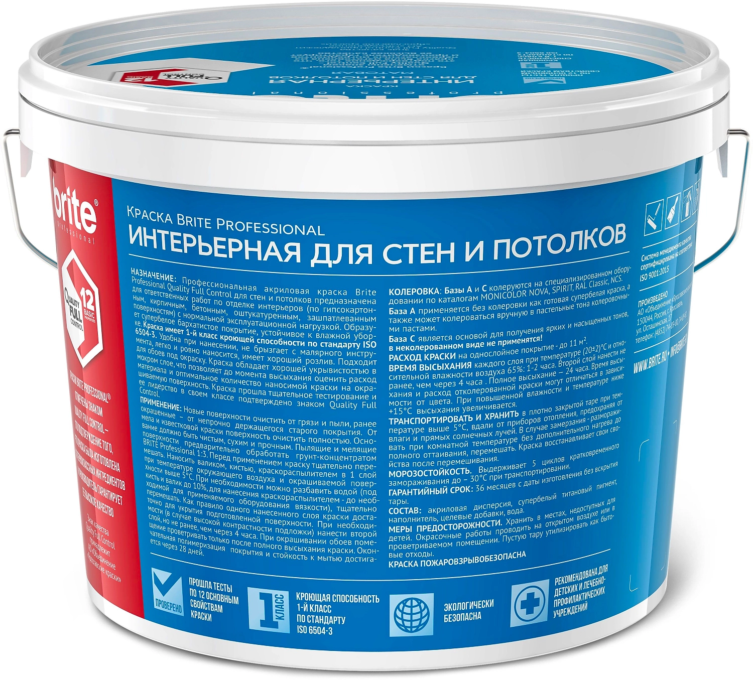 Профессиональная акриловая краска Brite Professional Quality Full Control для стен и потолков. После высыхания образует супербелое матовое покрытие, устойчивое к сухой уборке.