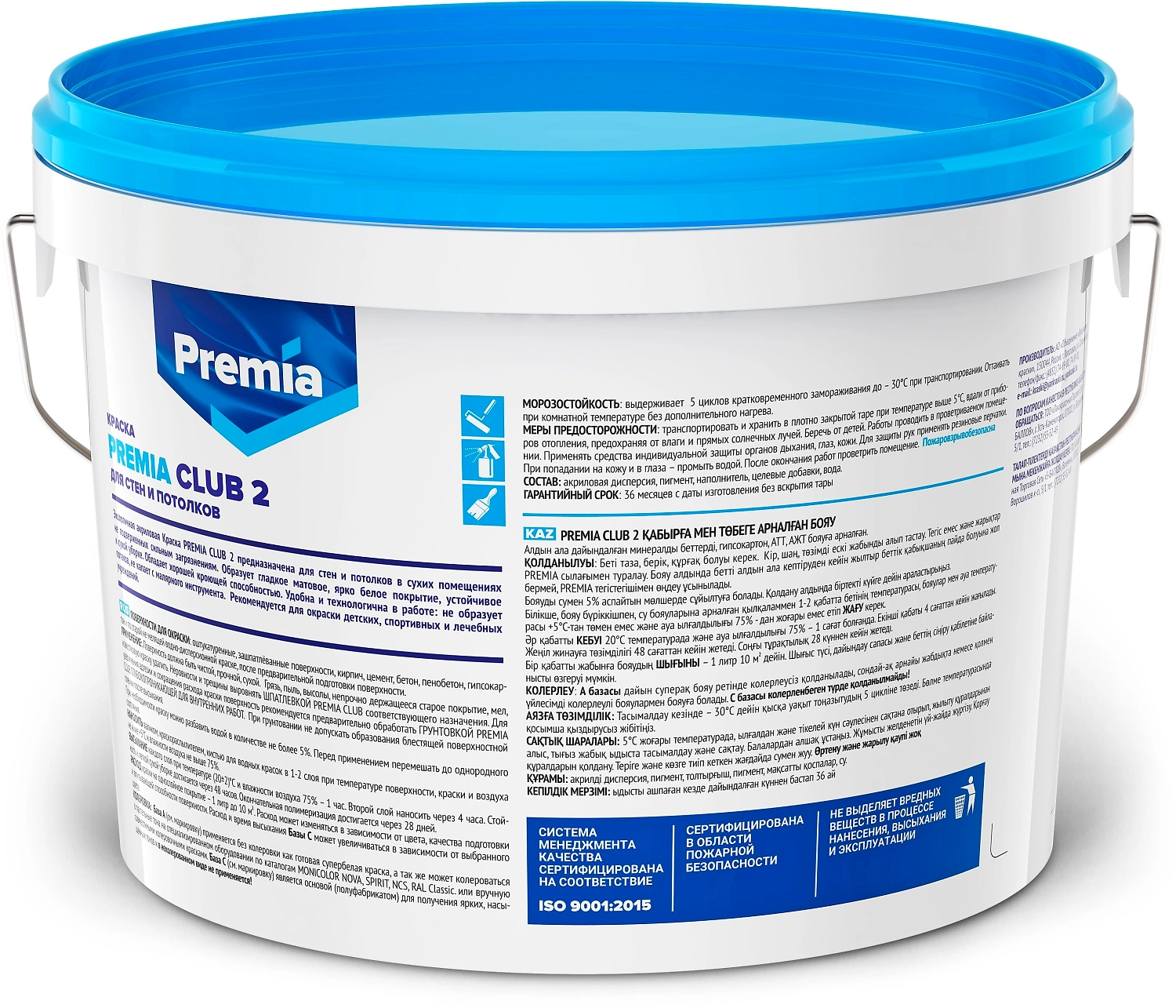 PREMIA CLUB 2 не выделяет вредных веществ в процессе применения, высыхания и эксплуатации, поэтому вы можете использовать её для окраски жилых помещений, детских, лечебных и спортивных учреждений, а так же офисов и банкетных залов.