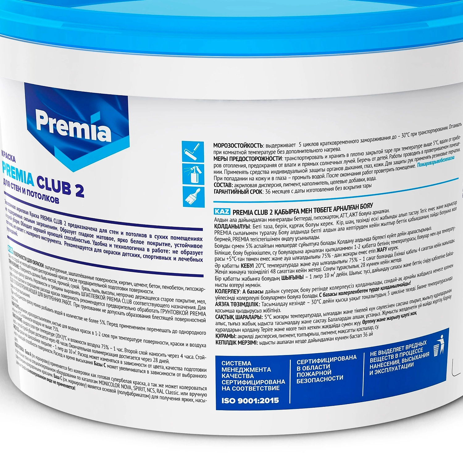 Интерьерная акриловая краска для стен и потолков PREMIA CLUB 2 - это то, что нужно для воплощения дизайнерских задумок и создания уюта в вашем доме. Краска обладает хорошей кроющей способностью, что позволяет сократить затраты на количество материала, а ослепительно - белое матовое покрытие подарит помещению эстетический вид и не пожелтеет со временем.