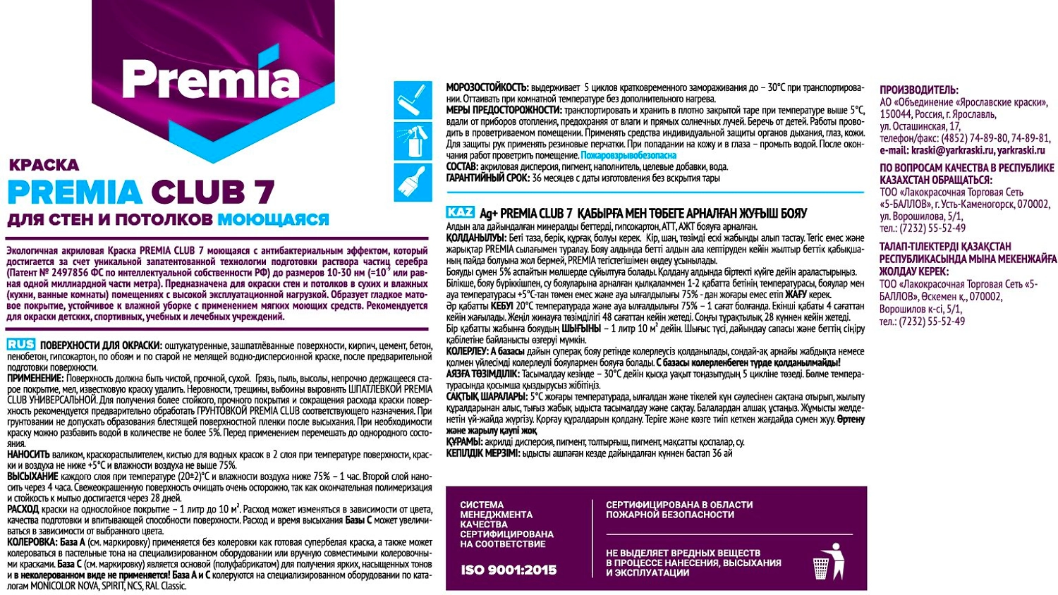 PREMIA CLUB 7 - лучший выбор для окраски ванных комнат, кухонь, коридоров, парадных и других помещений, где необходима регулярная влажная уборка. Покрытие выдерживает более 50 000 проходов щеткой.