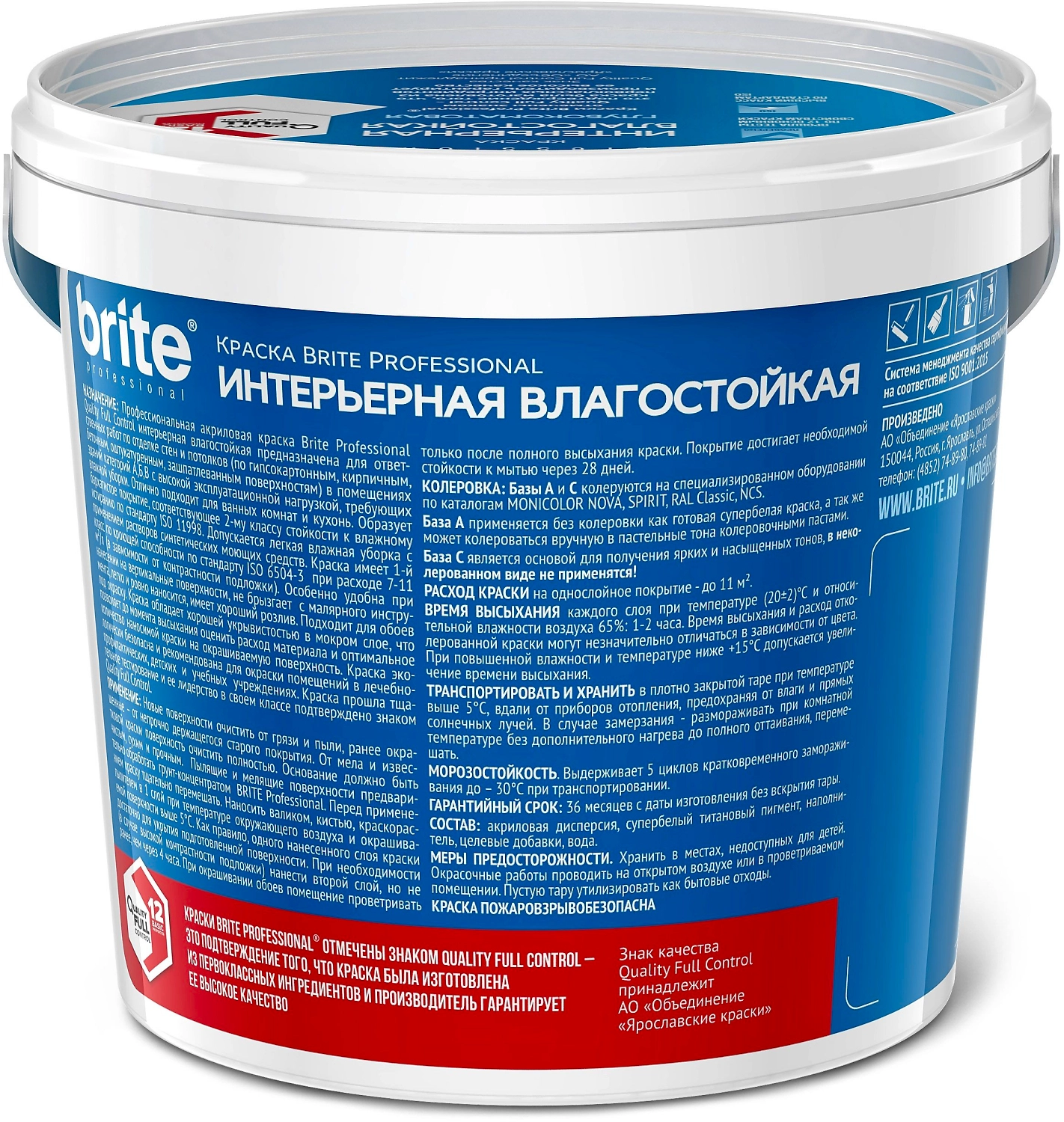 Профессиональная акриловая краска Brite Professional Quality Full Control интерьерная влагостойкая глубокоматовая. Рекомендована для отделки стен и потолков в помещениях, требующих влажной уборки с применением растворов синтетических моющих средств. Образует бархатистое покрытие, которое соответствует 1-му классу стойкости к влажному истиранию по стандарту ISO 11998.