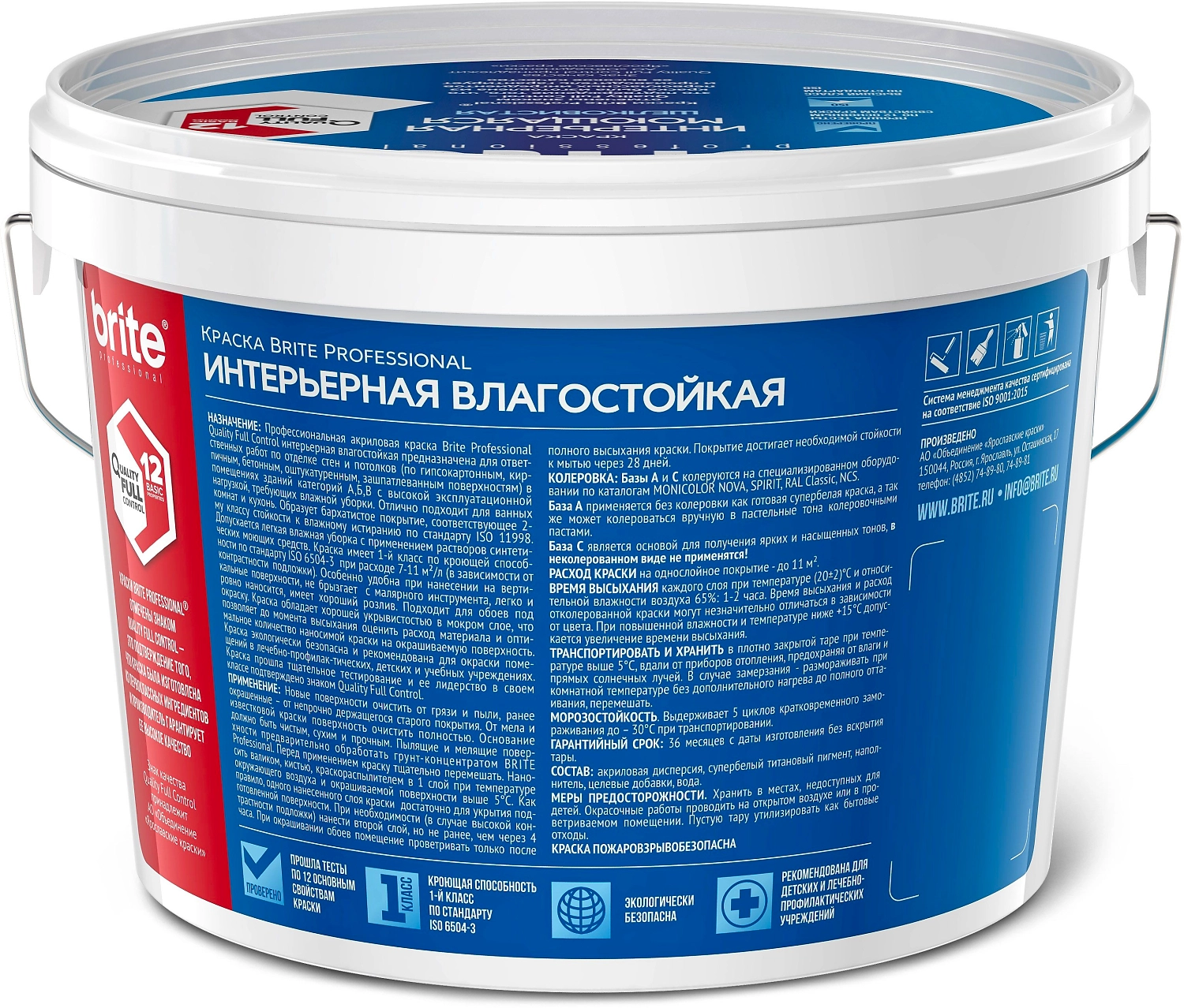 Профессиональная акриловая краска Brite Professional Quality Full Control интерьерная влагостойкая глубокоматовая. Рекомендована для отделки стен и потолков в помещениях, требующих влажной уборки с применением растворов синтетических моющих средств. Образует бархатистое покрытие, которое соответствует 1-му классу стойкости к влажному истиранию по стандарту ISO 11998.