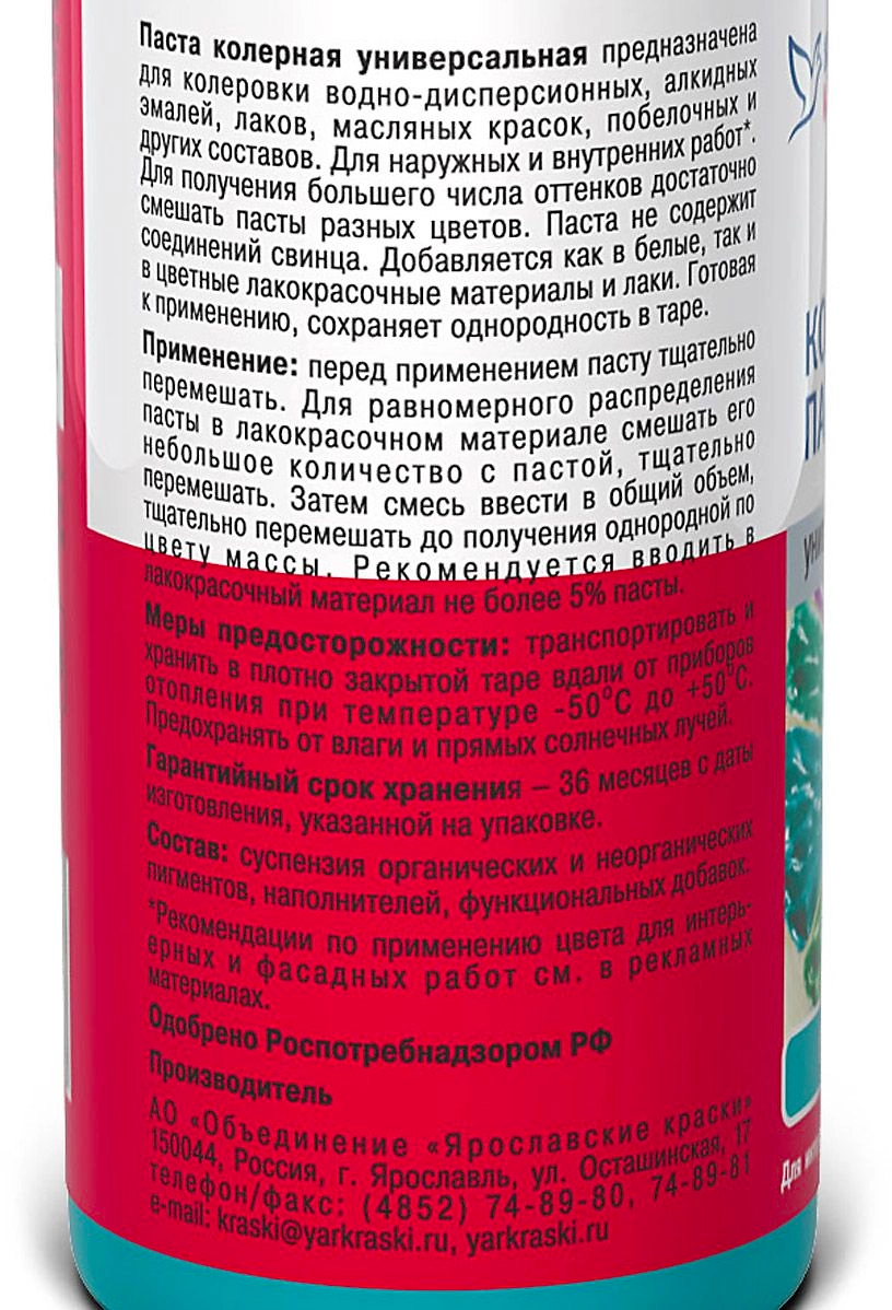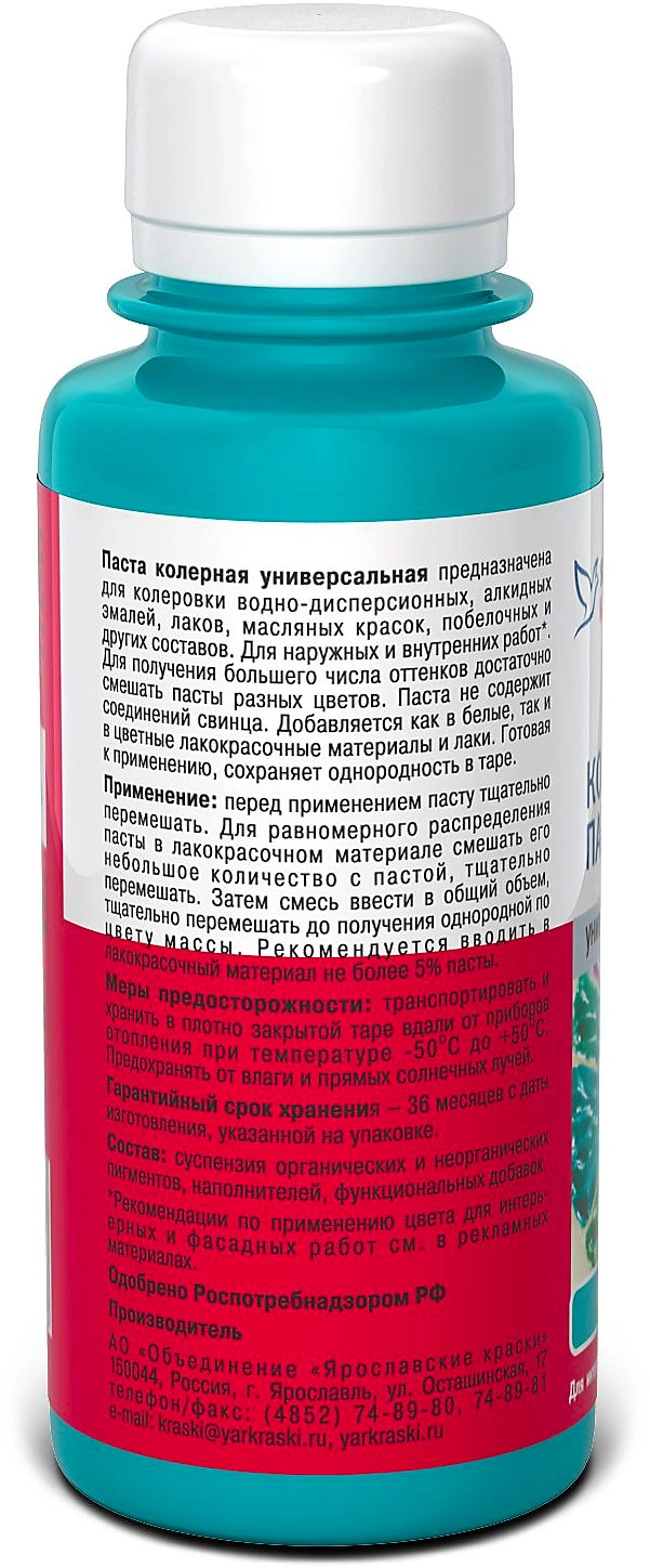 Паста колерная универсальная ЯРОСЛАВСКИЕ КРАСКИ предназначена для ручной колеровки водно-дисперсионных и масляных красок, алкидных эмалей, лаков, побелочных составов, для наружных и внутренних работ.