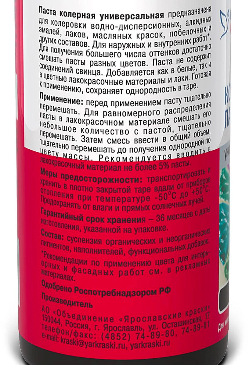 Паста колерная универсальная ЯРОСЛАВСКИЕ КРАСКИ предназначена для ручной колеровки водно-дисперсионных и масляных красок, алкидных эмалей, лаков, побелочных составов, для наружных и внутренних работ.