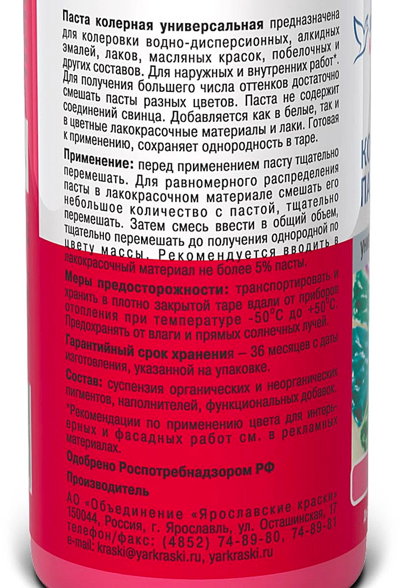 Паста колерная универсальная ЯРОСЛАВСКИЕ КРАСКИ предназначена для ручной колеровки водно-дисперсионных и масляных красок, алкидных эмалей, лаков, побелочных составов, для наружных и внутренних работ.