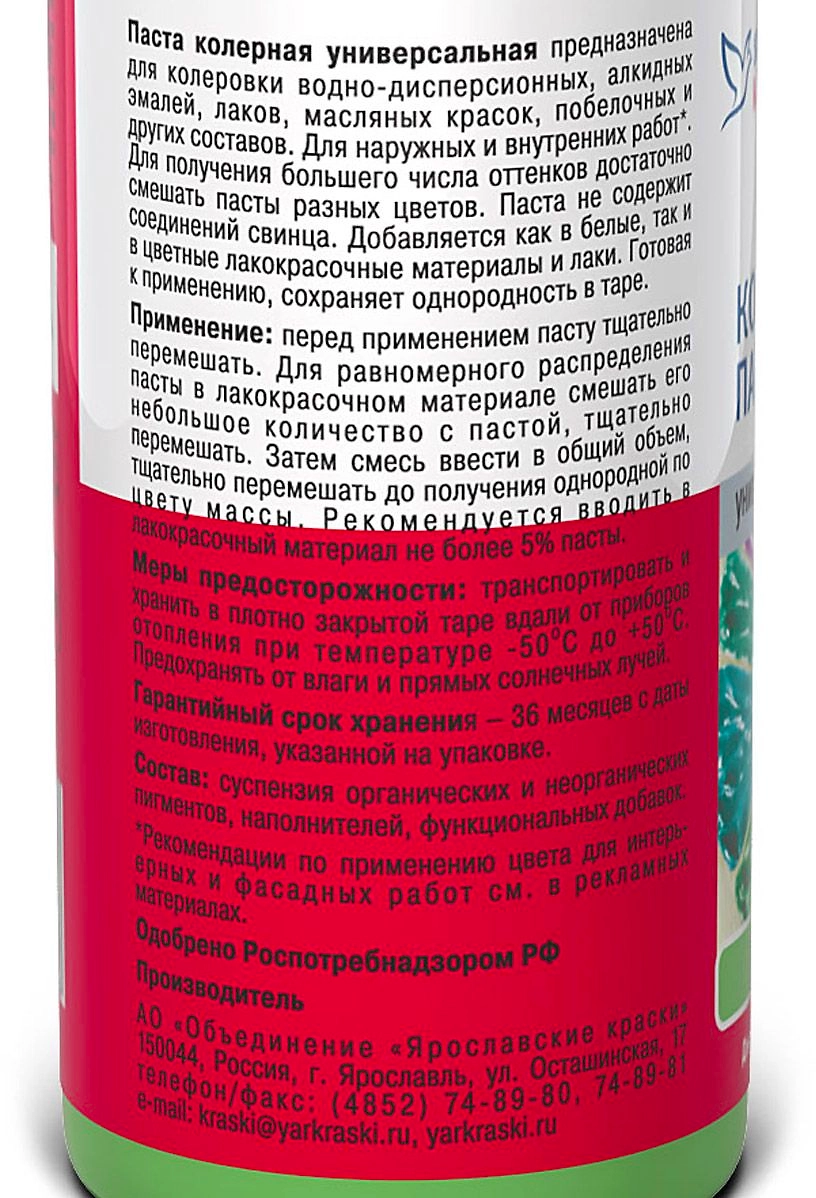 Паста колерная универсальная ЯРОСЛАВСКИЕ КРАСКИ предназначена для ручной колеровки водно-дисперсионных и масляных красок, алкидных эмалей, лаков, побелочных составов, для наружных и внутренних работ.