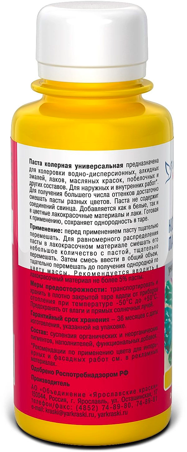 Паста колерная универсальная ЯРОСЛАВСКИЕ КРАСКИ предназначена для ручной колеровки водно-дисперсионных и масляных красок, алкидных эмалей, лаков, побелочных составов, для наружных и внутренних работ.