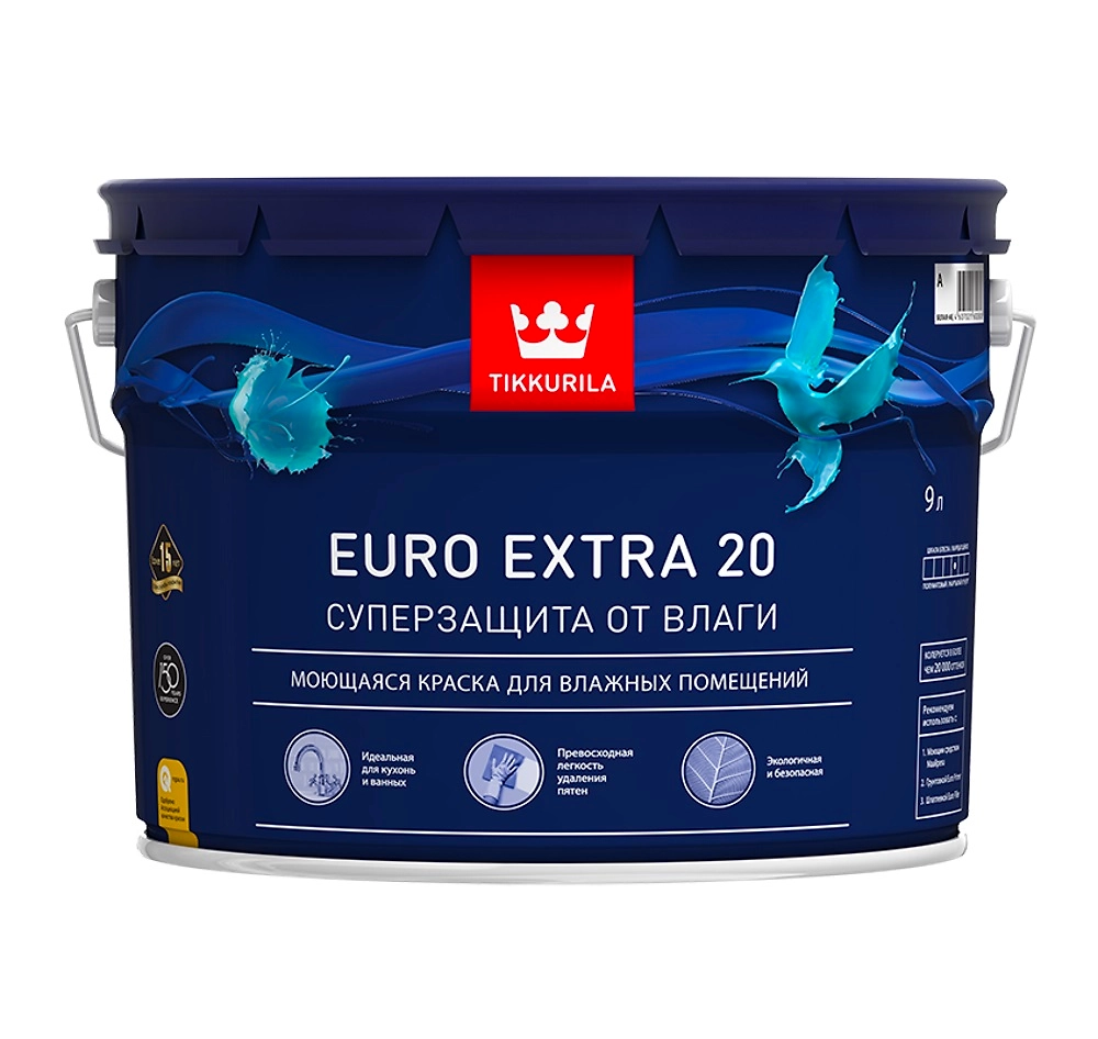 Tikkurila EURO EXTRA 20 A - водорастворимая интерьерная краска для стен и потолка, образующая суперстойкое моющееся покрытие.