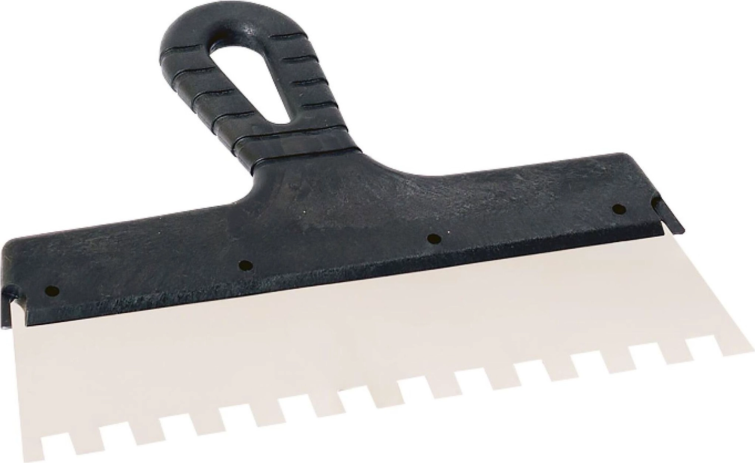 Шпатель зубчатый – оснащен эргономичной пластмассовой ручкой, основной рабочей частью шпателя является металлическое полотно, поэтому для производства шпателей мы используем нержавеющую сталь.