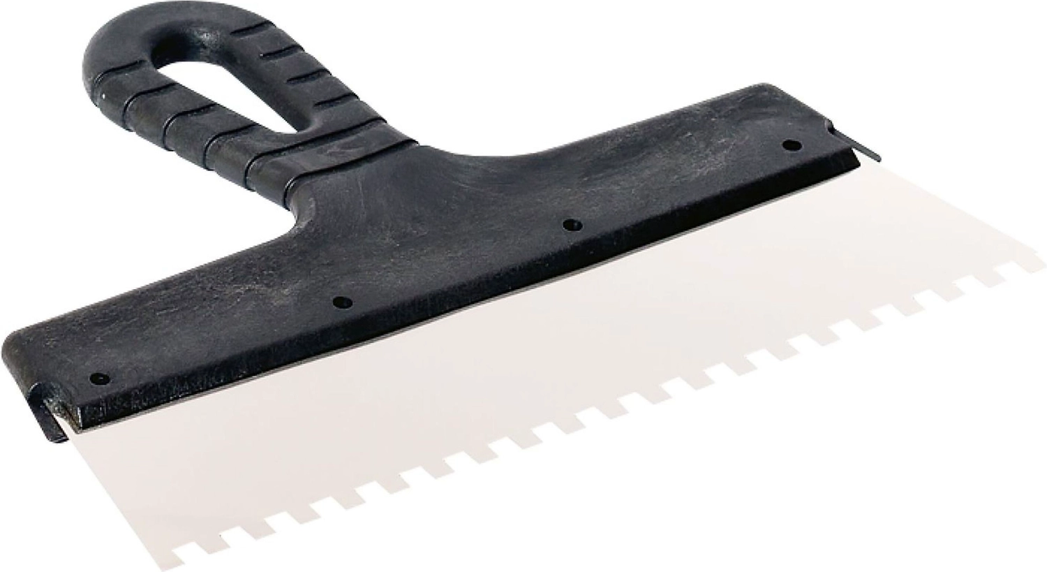 Шпатель зубчатый – оснащен эргономичной пластмассовой ручкой, основной рабочей частью шпателя является металлическое полотно, поэтому для производства шпателей мы используем нержавеющую сталь. Сталь данной марки обладает улучшенными механическими свойствами. Используются шпатель для нанесения и выравнивания клеевых и штукатурных составов на поверхности большой площади.