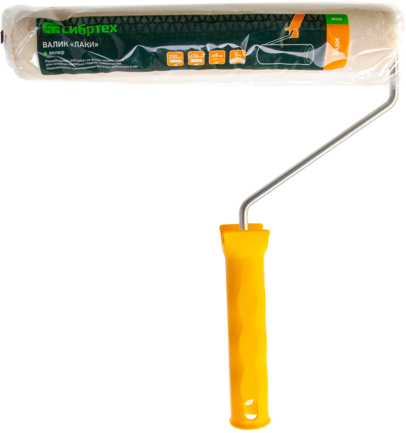 Валик Сибртех «Лаки» 80243 с ворсом 5 мм из велюра, ручкой 6 мм, роликом 250 х 36 мм обеспечивает нанесение ЛКМ тонким слоем, что делает его лучшим помощником для работ с лаками на гладких