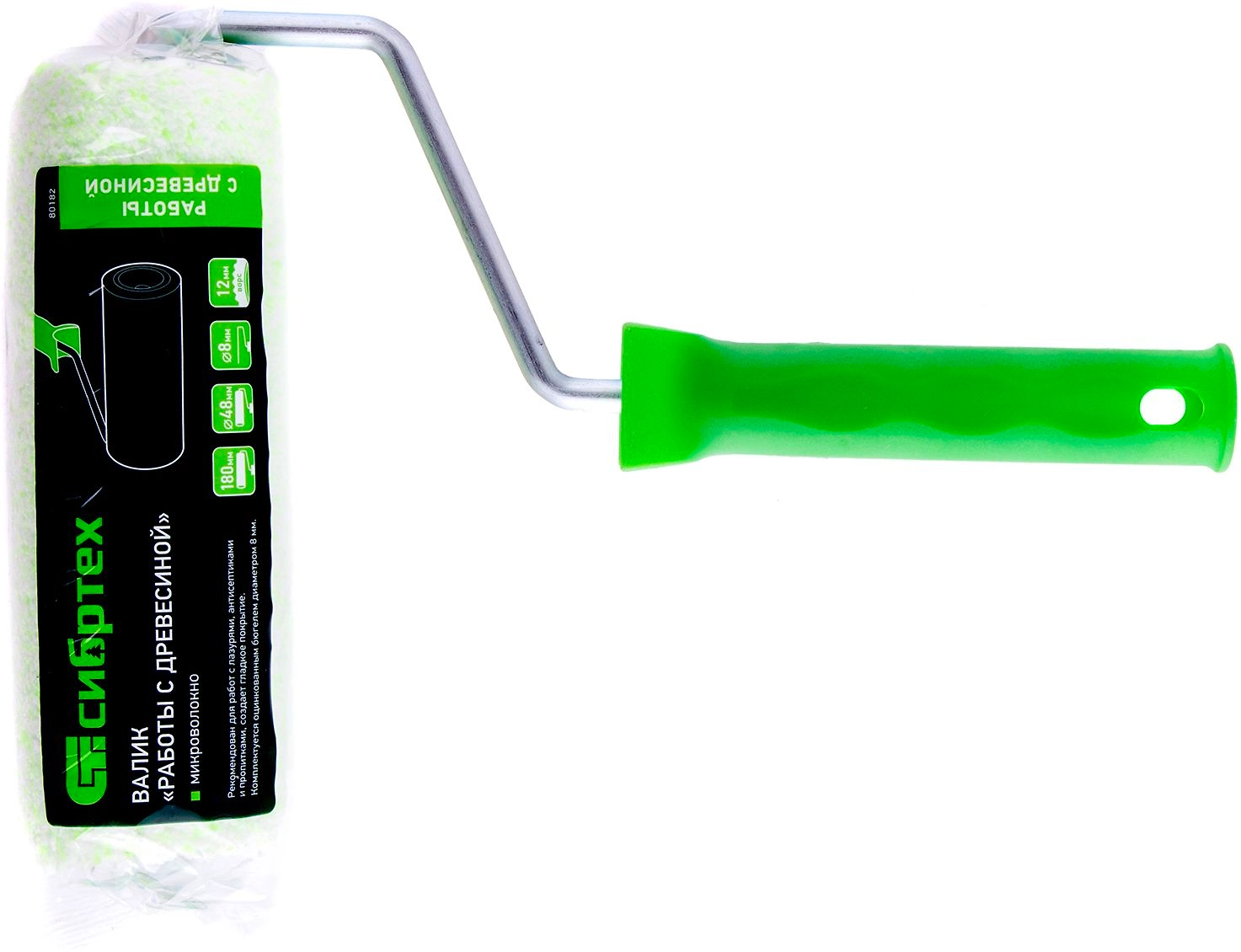 Валик Сибртех «Работы с древесиной» 80182 шириной 180 мм, ворсом 12 мм из микроволокна, диаметром ролика 48 мм и ручкой 8 мм оптимален для работ с жидкими лакокрасочными материалами: антисептиками,