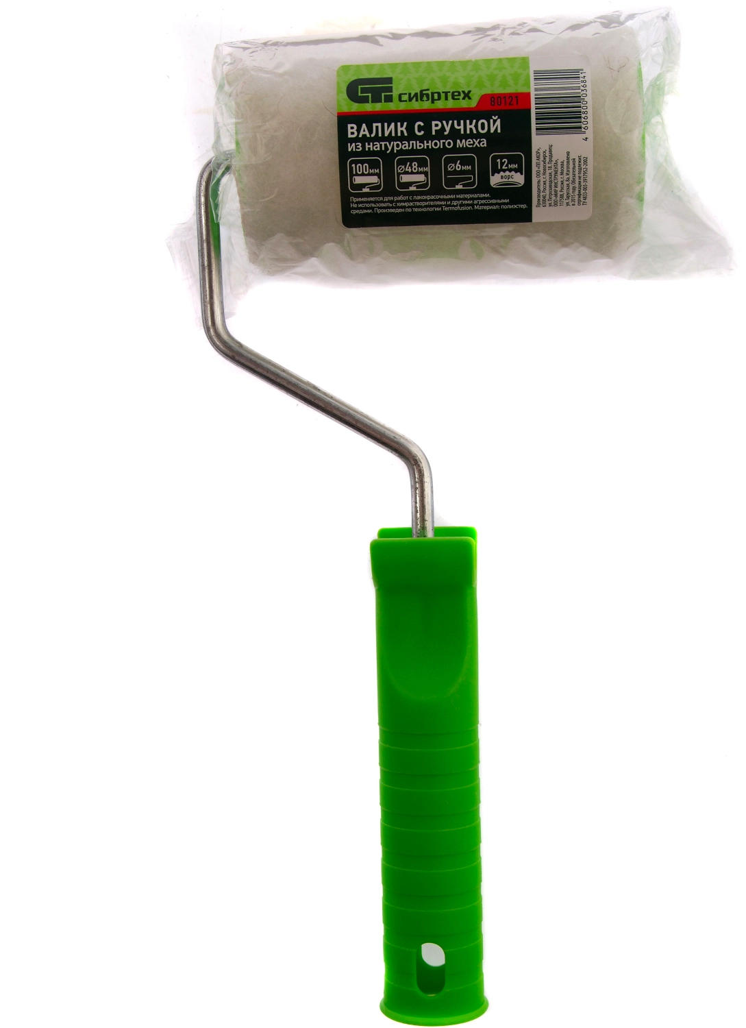 Валик с натуральным мехом Сибртех 80121, с ворсом 12 мм, ручкой 6 мм, диаметром ролика 48 мм и шириной 100 мм позволяет работать с эмалями, масляными и водно-дисперсионными красками, а также