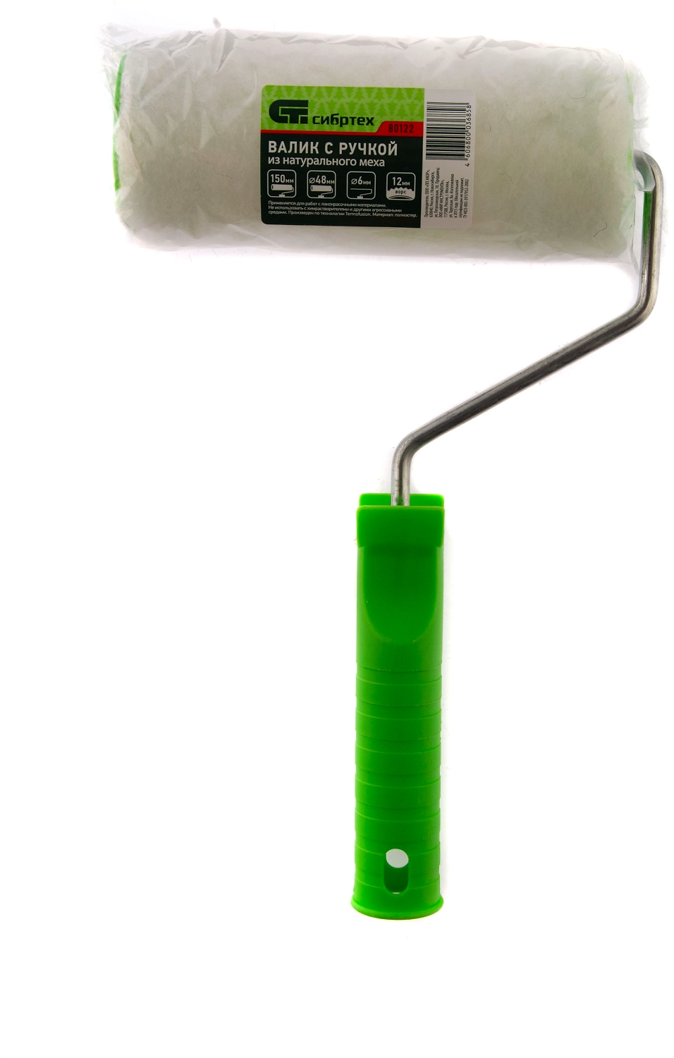 Валик с натуральным мехом Сибртех 80122, с ворсом 12 мм, ручкой 6 мм, диаметром ролика 48 мм и шириной 150 мм позволяет работать с эмалями, масляными и водно-дисперсионными красками, а также защитными покрытиями. Благодаря длине ворса 12 мм валик подходит для окрашивания не только гладких, но и шероховатых поверхностей.