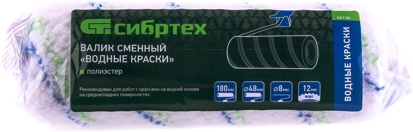 Сменный валик Сибртех "Водные краски" 80138 с ворсом 12 мм из полиэстера, шириной ролика 180 мм и диаметром 48 мм, ручкой 8 мм оптимален для работы с водно-дисперсионными красками.