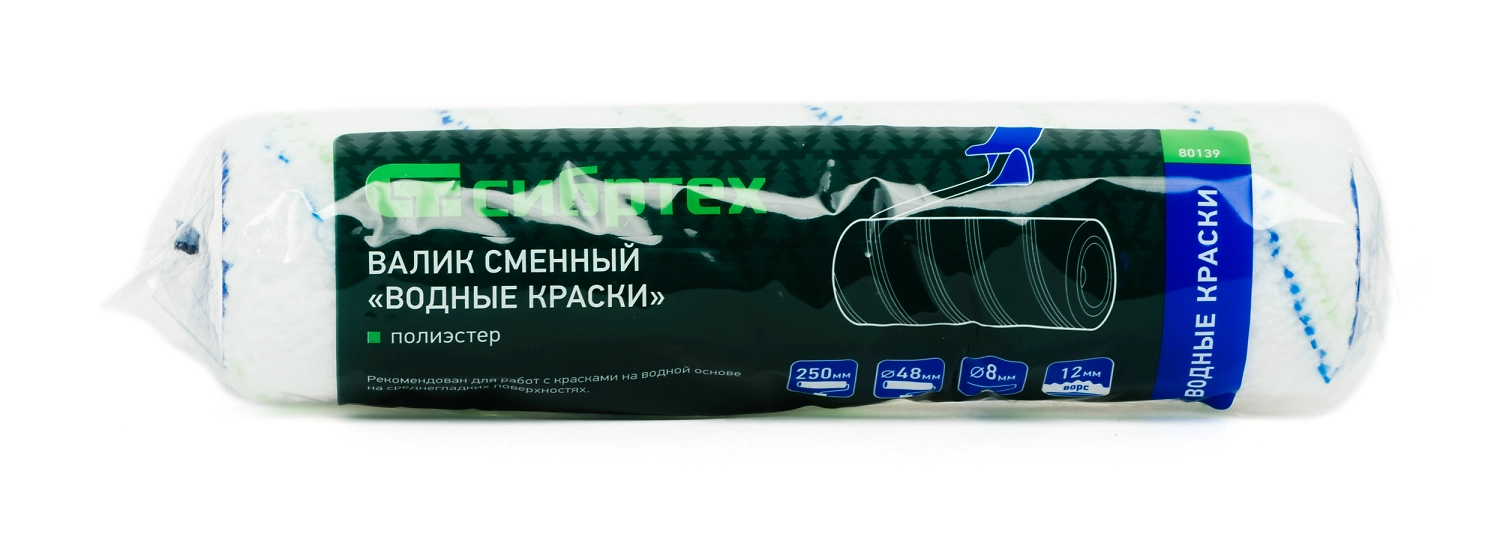 Сменный валик Сибртех "Водные краски" 80139 с ворсом 12 мм из полиэстера, шириной ролика 250 мм и диаметром 48 мм, ручкой 8 мм оптимален для работы с водно-дисперсионными красками.