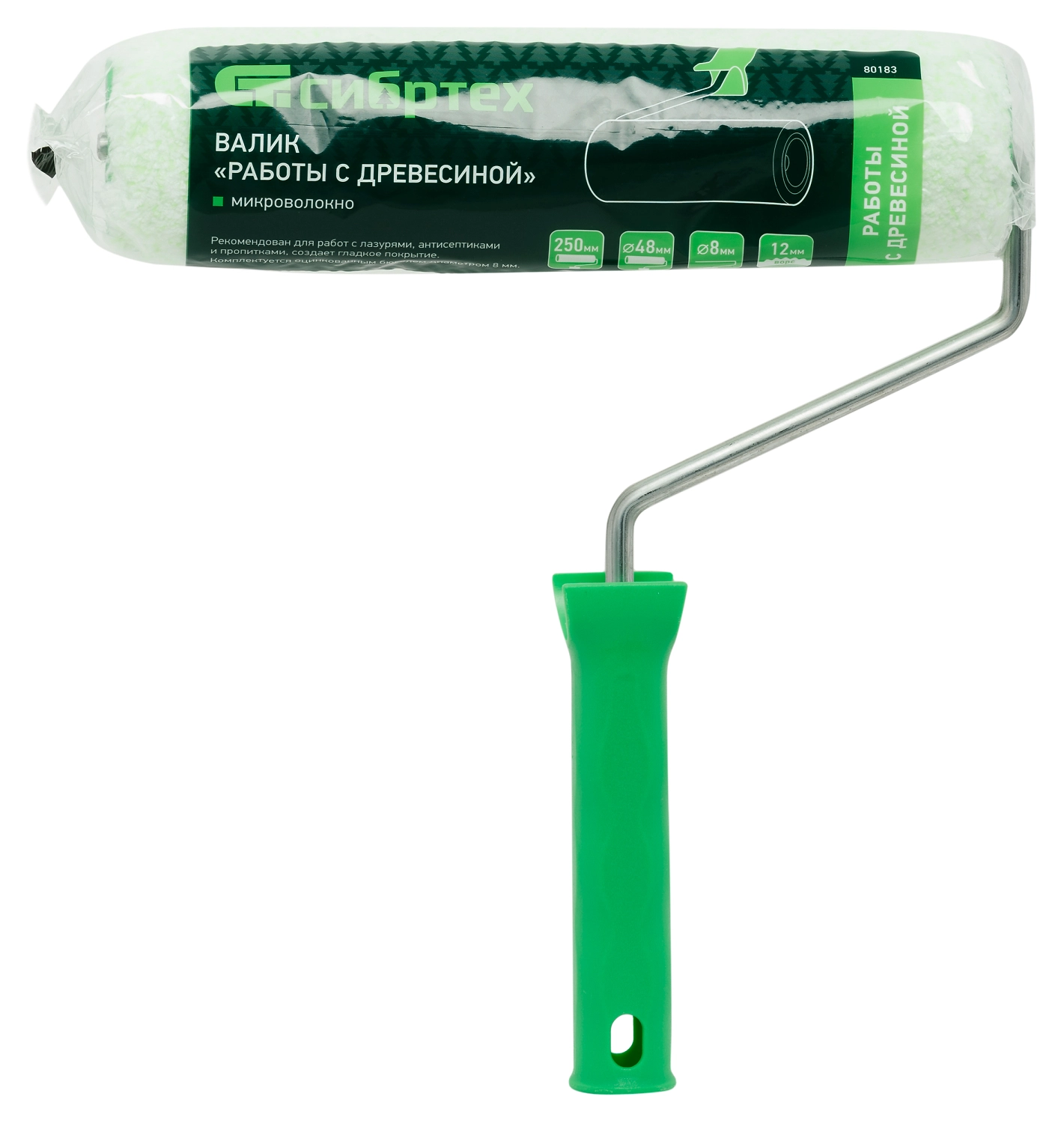 Валик Сибртех "Работы с древесиной" 80183 шириной 250 мм, ворсом 12 мм из микроволокна, диаметром ролика 48 мм и ручкой 8 мм оптимален для работ с жидкими лакокрасочными материалами: антисептиками,