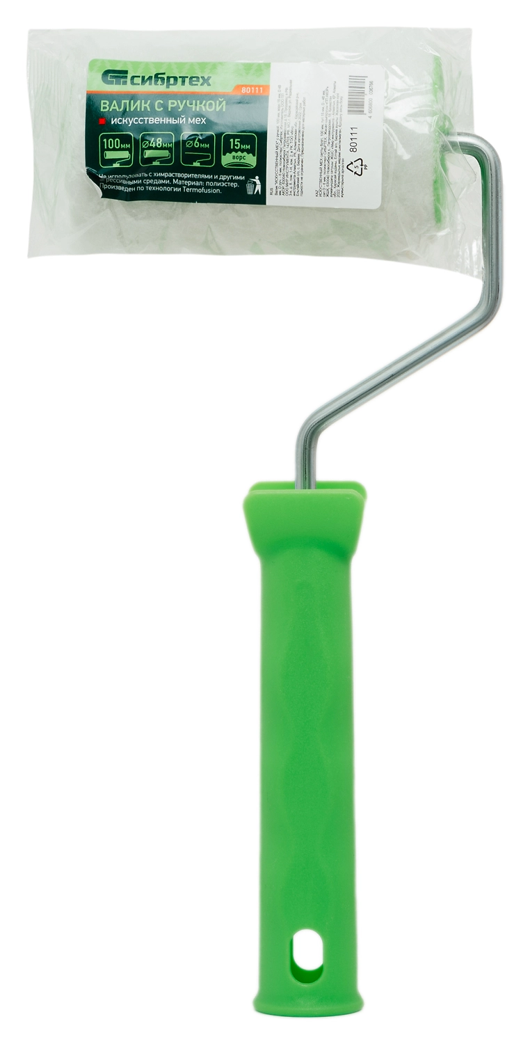 Валик Сибртех "ИСКУССТВЕННЫЙ МЕХ" 80111 из полиэстера с ручкой 6 мм, ворсом 15 мм, шириной ролика 100 мм и диаметром 48 мм предназначен для проведения подготовительных и общемалярных работ.