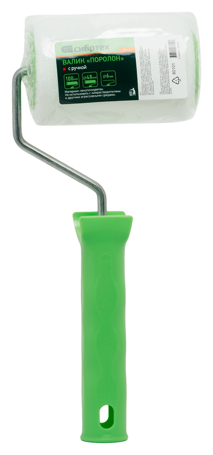 Валик Сибртех "ПОРОЛОН" 80101 шириной 100 мм, диаметром 48 мм, с ручкой 6 мм используется при проведении малярных работ с жидкими водно-дисперсионными ЛКМ: латексными, акриловыми, а также грунтовками