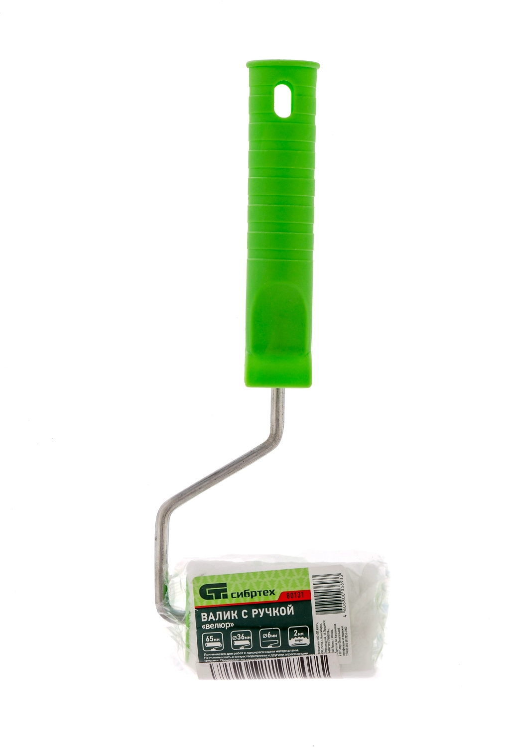 Валик Сибртех «ВЕЛЮР» 80131 с ручкой 6 мм, шириной ролика 75 мм и диаметром 36 мм, длиной ворса 5 мм, применяется для окрашивания гладких поверхностей.