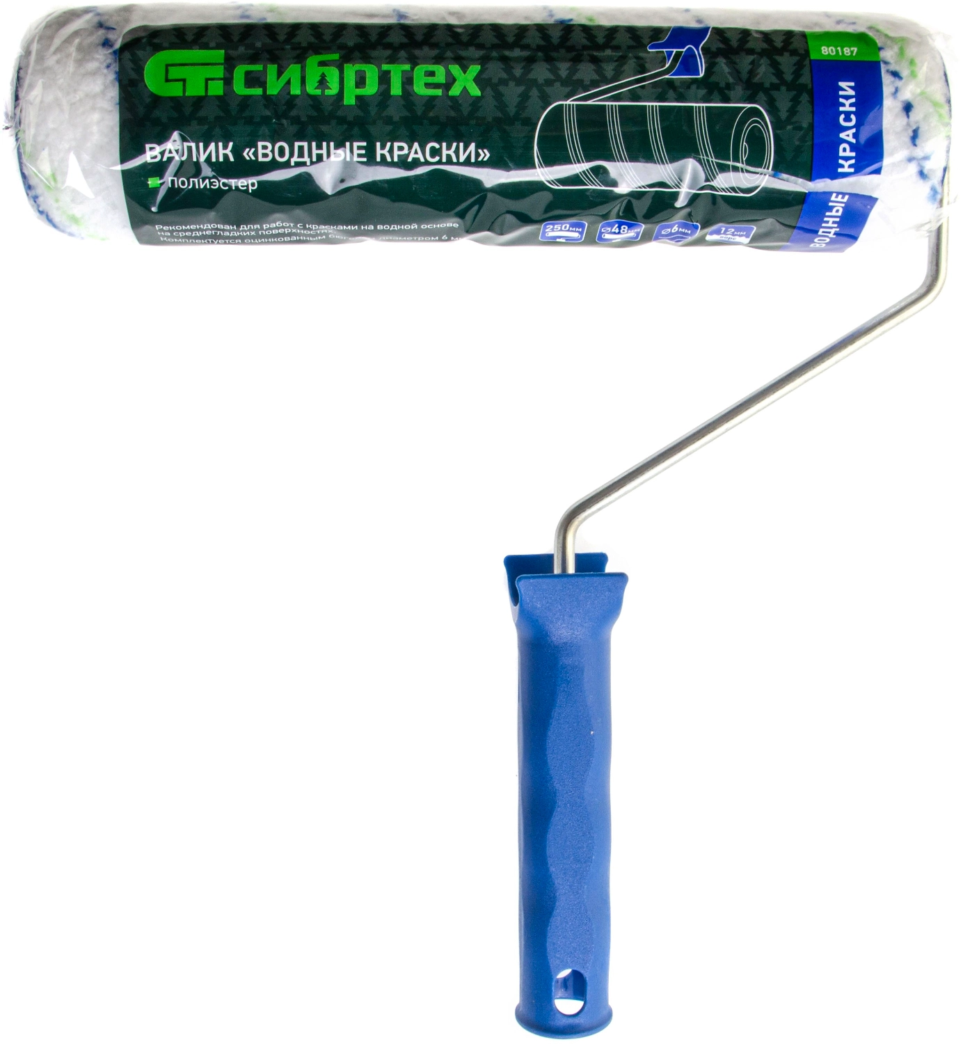 Валик Сибртех «Водные краски» 80187 с ворсом из полиэстера 12 мм, с ручкой 6 мм, шириной ролика 250 мм и диаметром 48 мм, используется для окрашивания поверхностей средней гладкости.