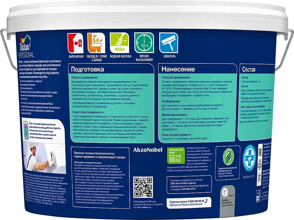 Готовая к применению финишная шпатлевка для стен и потолков. Идеально подходит как для шпатлевания больших площадей, так и для заделывания трещин и швов в сухих помещениях. Рекомендуется под окраску водно-дисперсионными красками и под обои. Легко наносится, разравнивается и шлифуется, идеально выравнивая поверхность. Отлично сочетается с интерьерными красками Dulux. Доступна колеровка. Возможность колеровки предусмотрена прежде всего с целью сокращения расхода краски до 30%, что особенно актуально при окрашивании в насыщенные оттенки. Повторное воспроизведение цвета не гарантируется. Шпатлевка также может использоваться в неколерованном виде. Белоснежное покрытие минимизирует расход краски белых и пастельных тонов.