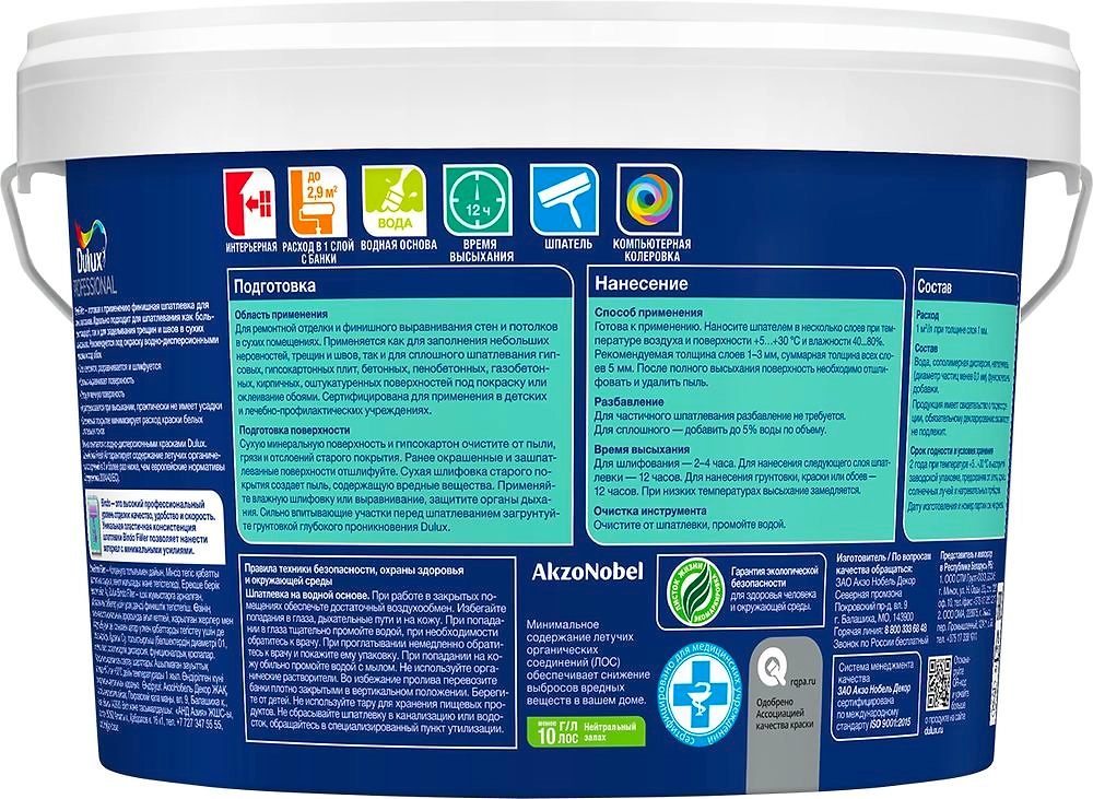 Готовая к применению финишная шпатлевка для стен и потолков. Идеально подходит как для шпатлевания больших площадей, так и для заделывания трещин и швов в сухих помещениях. Рекомендуется под окраску водно-дисперсионными красками и под обои. Легко наносится, разравнивается и шлифуется, идеально выравнивая поверхность. Отлично сочетается с интерьерными красками Dulux. Доступна колеровка. Возможность колеровки предусмотрена прежде всего с целью сокращения расхода краски до 30%, что особенно актуально при окрашивании в насыщенные оттенки. Повторное воспроизведение цвета не гарантируется. Шпатлевка также может использоваться в неколерованном виде. Белоснежное покрытие минимизирует расход краски белых и пастельных тонов.