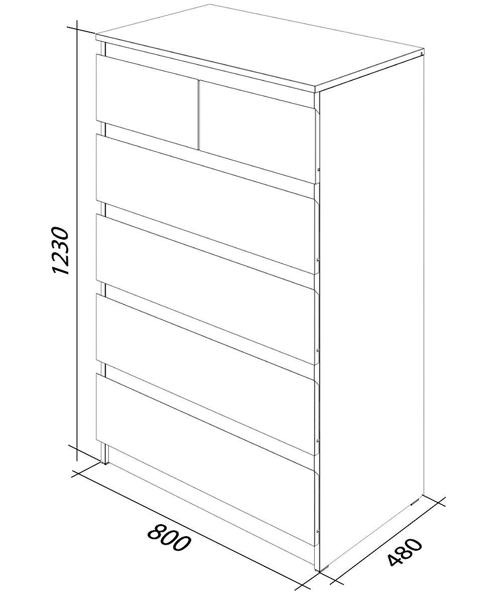 - Нижняя часть комода закрыта цокольной планкой, предотвращающей попадание под мебель мусора, пыли, упавших на пол предметов.