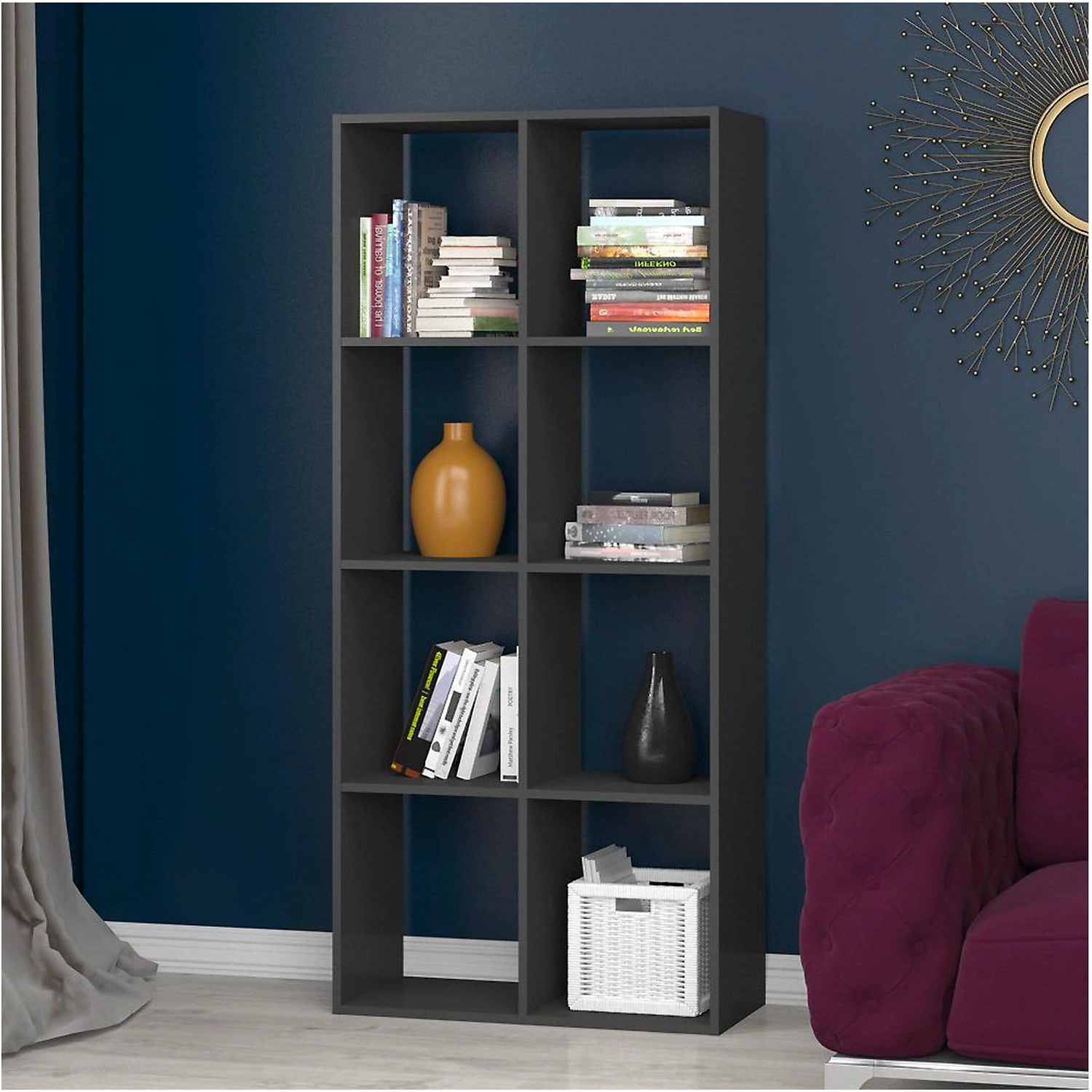 Стеллаж универсальный ФЕЛИКС ЛДСП 164х73х34 см в оттенке антрацит удачно дополняет четкие линии и лаконичные формы интерьера в скандинавском стиле или стиле хай-тек. За счет темного насыщенного оттенка стеллаж может стать частью декоративной композиции, привлекающей внимание, либо напротив остаться в тени - в зависимости от назначения изделия в конкретном помещении. Восемь вместительных ячеек создают дополнительное пространство для хранения.