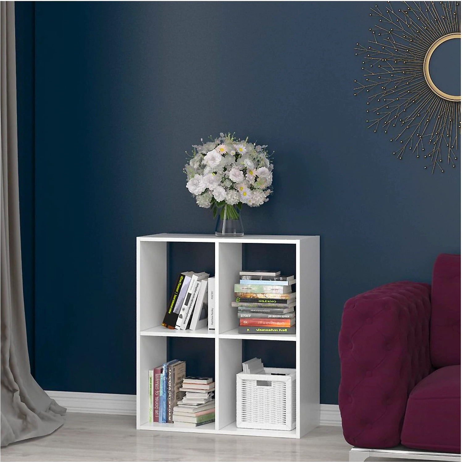 Четырехсекционный стеллаж открытого типа из ЛДСП - универсальный предмет мебели. Организует функциональное пространство помещений разного назначения, а также может составлять декоративное оформление. Стеллаж универсальный ФЕЛИКС ЛДСП 83х73х34 см белый состоит из четырех открытых ячеек и органично вписывается в любой современный интерьер.