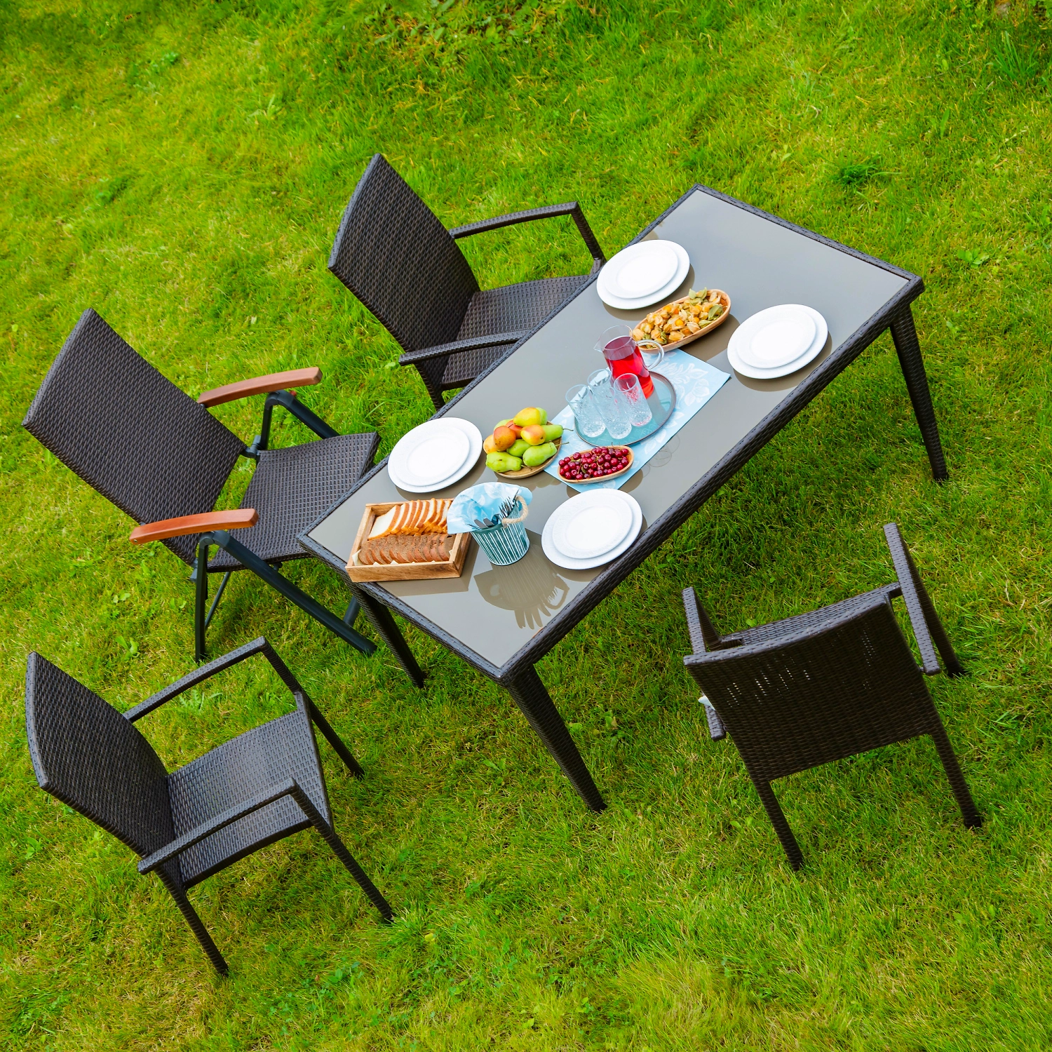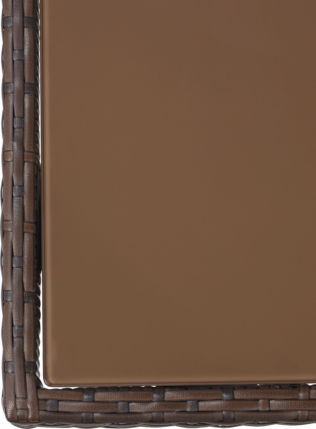 Стол выполнен в темно-коричневом цвете и отлично смотрится среди зелени сада. Гладкая столешница из закаленного стекла дополнена эффектным плетением из полиротанга. Алюминиевый каркас обеспечивает изделию дополнительную жесткость и устойчивость.
