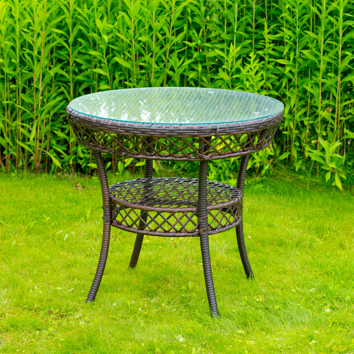 Круглый стол Patro выполнен из металла и искусственного ротанга. Роскошный образ дополняют изогнутые ножки, ажурное плетение и эффектная стеклянная столешница.