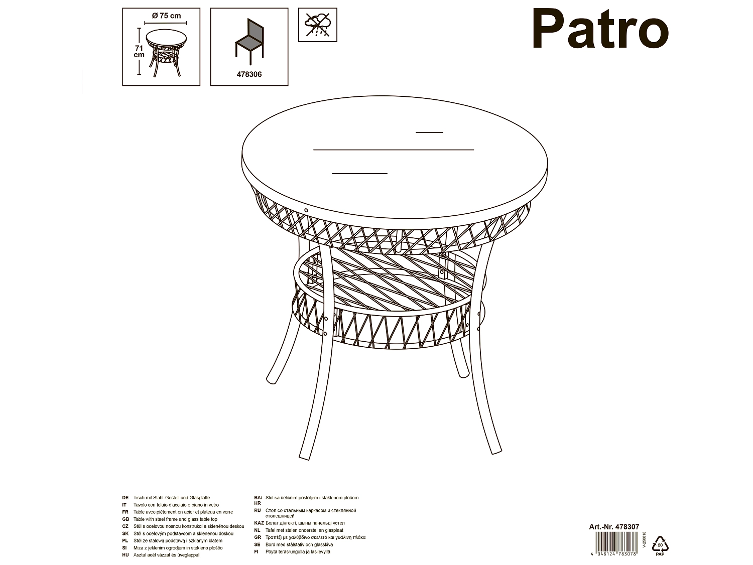 Садовый стол Patro устанавливается как в помещении, так и на улице, интересно смотрится со стульями из той же серии.