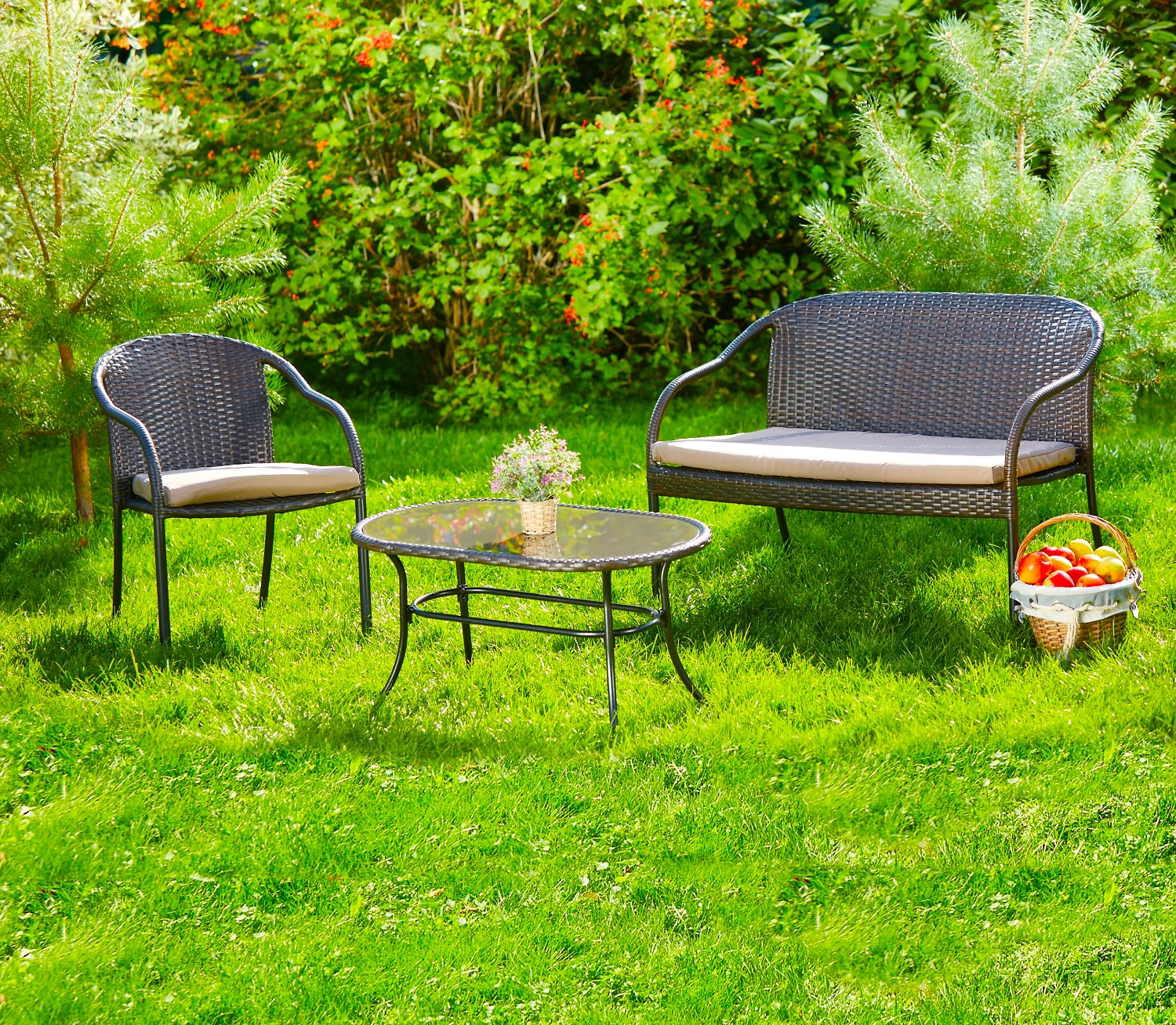 Чайный столик с плетеными из ротанга элементами прекрасно вписывается в садовый ландшафт, создает атмосферу романтики и уюта. Укомплектуйте его скамейкой или креслами, и получится комфортный уголок для отдыха на свежем воздухе.
